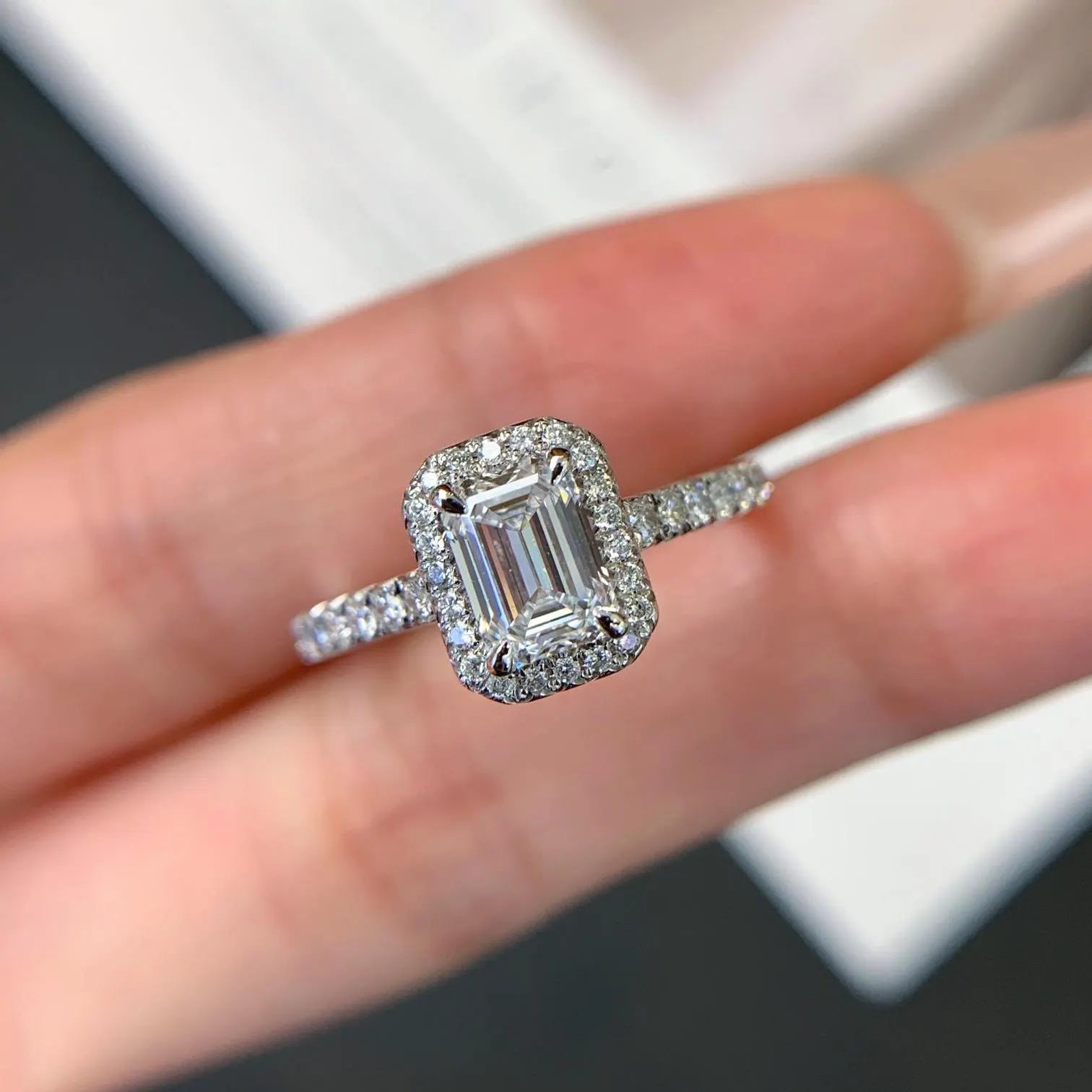 • Elegant emerald-cut with halo and pavé brilliance