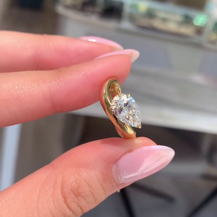 A modern twist on a timeless style — this 1.50tcw pear-shaped lab-grown diamond ring features a unique wave-style band in 10k/14k/18k gold. IGI certified, with D–E–F color and VVS–VS clarity, it’s elegant, ethical, and handcrafted to last a lifetime.