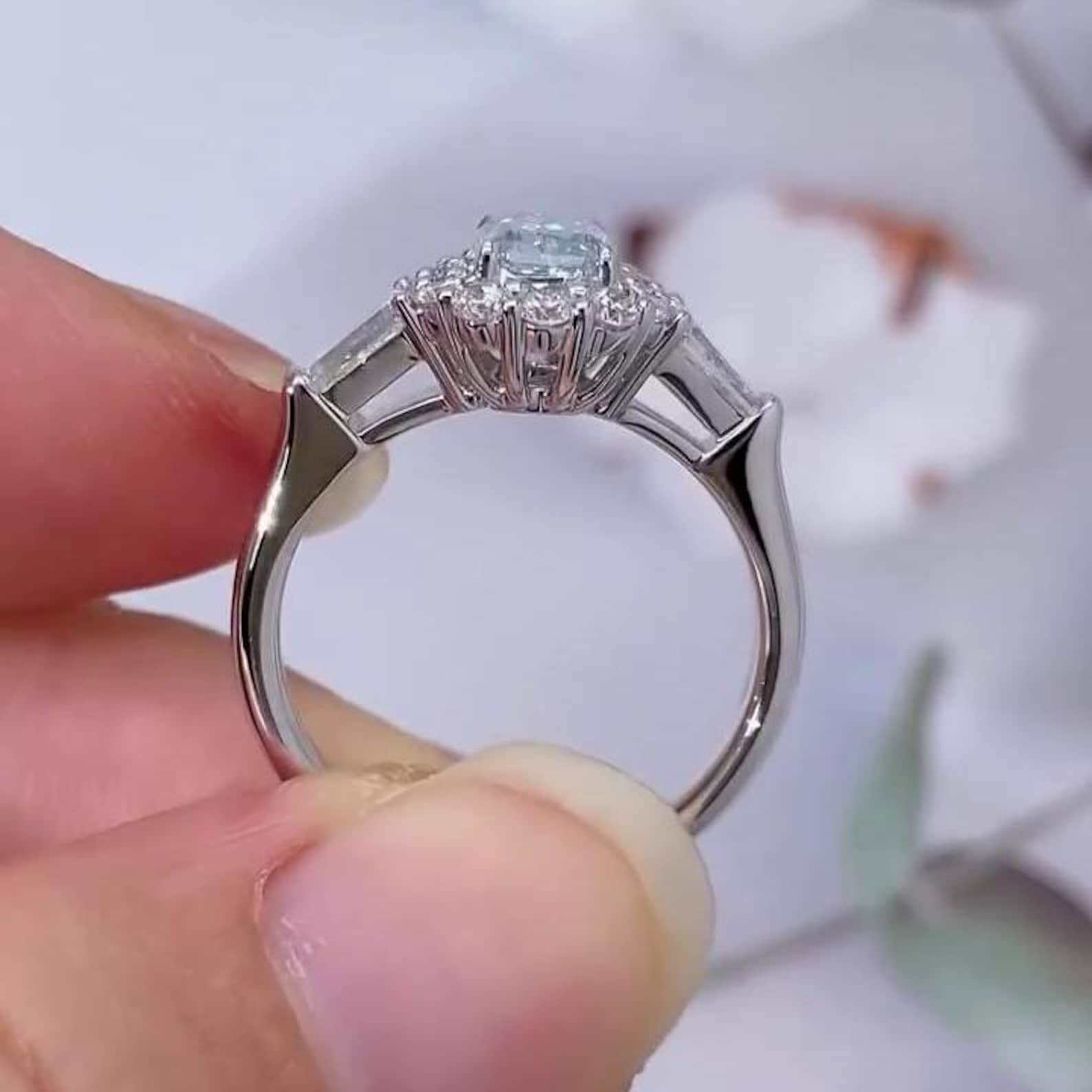 Make a statement with this 1.75tcw Radiant Fancy Blue Lab-Grown Diamond Ring. Features a 0.85ct IGI-certified center with round and tapered baguette halo accents. Crafted in 10k/14k/18k white gold, this three-stone ring blends color, sparkle, and timeless beauty.