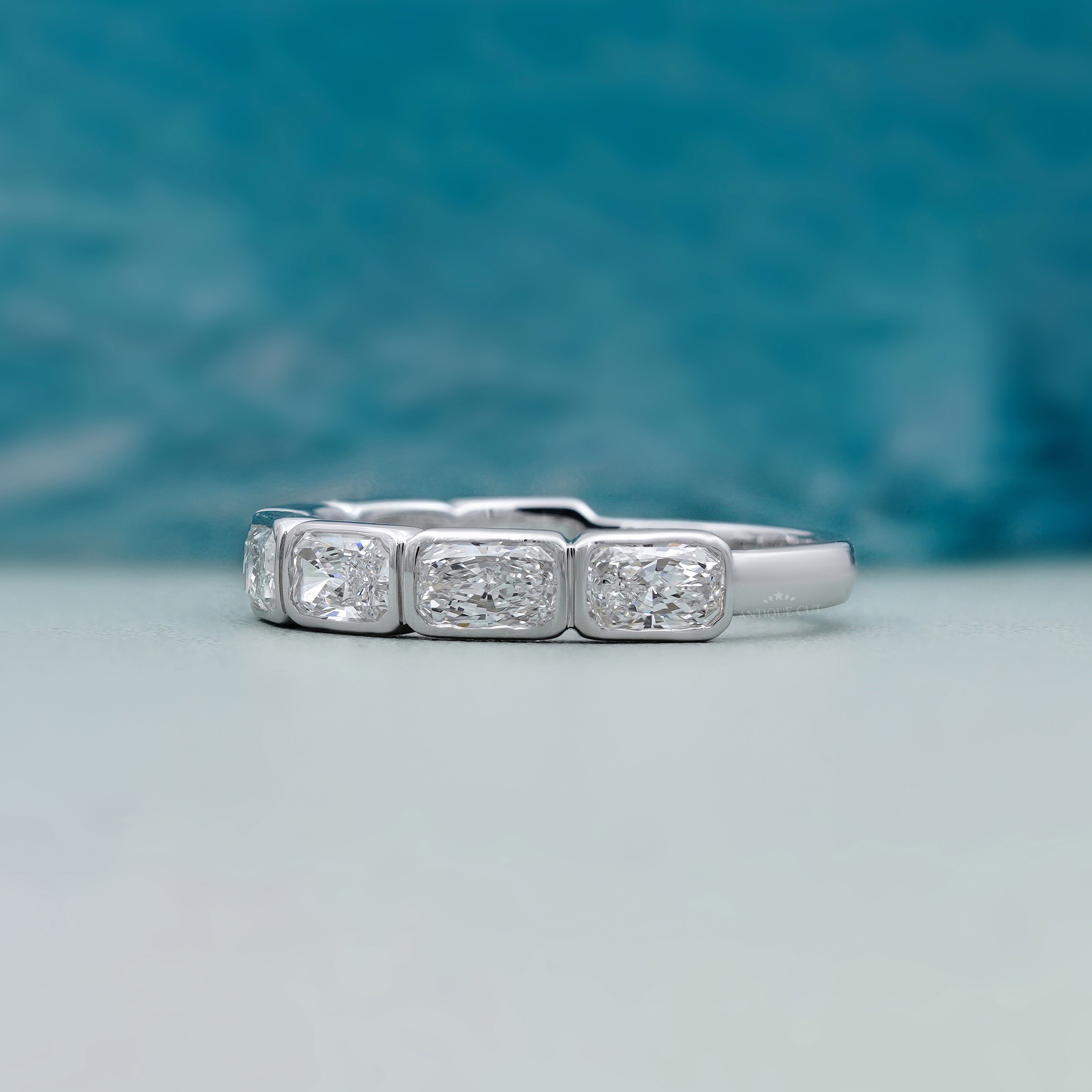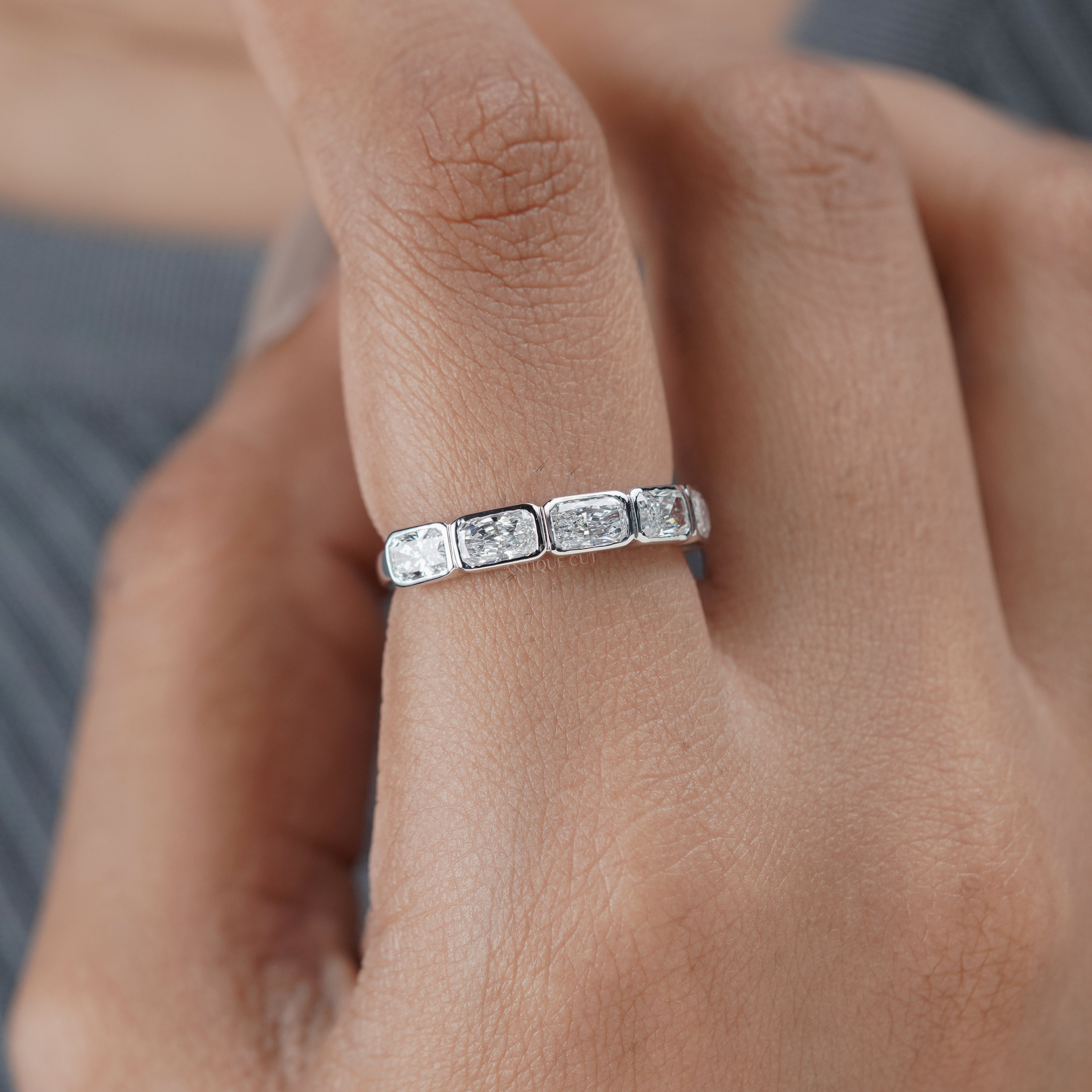 Celebrate everlasting love with this 2.10ct Radiant Cut Diamond Wedding Band, crafted with seven sparkling diamonds set in a sleek bezel design. The timeless elegance of radiant-cut diamonds makes this band a stunning choice as a wedding ring, anniversary band, or stackable ring.