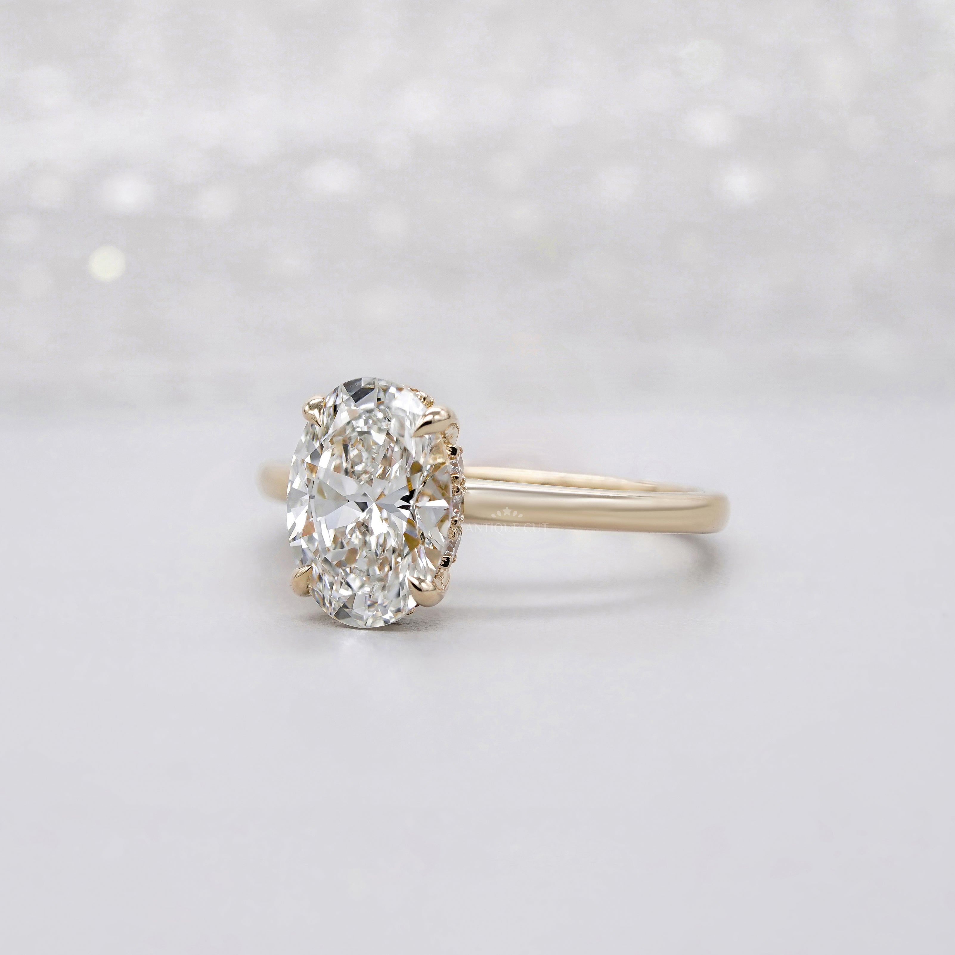 – Modern hidden halo design with clean oval center stone