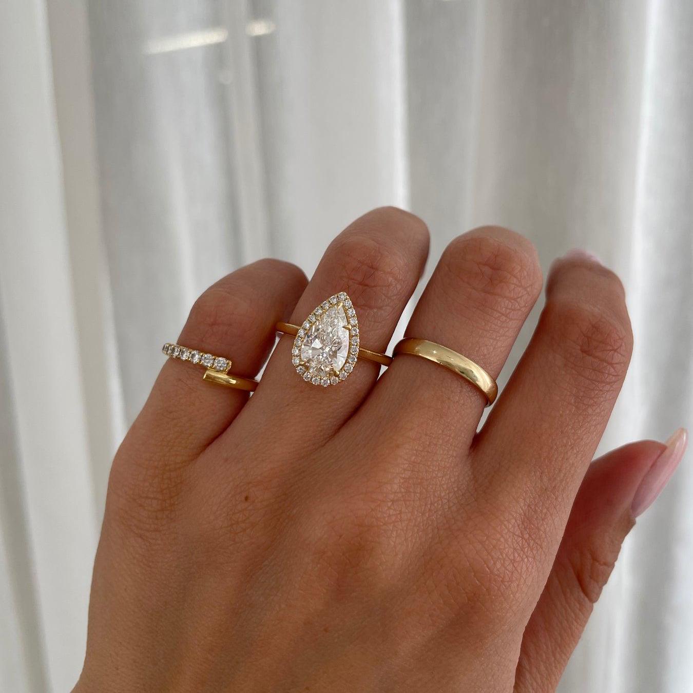 2.20tcw pear lab-grown diamond ring featuring a 2.00ct center stone with a radiant halo of round diamonds. IGI certified, D-E-F color, VVS-VS clarity β handcrafted in yellow gold for elegant, ethical brilliance.