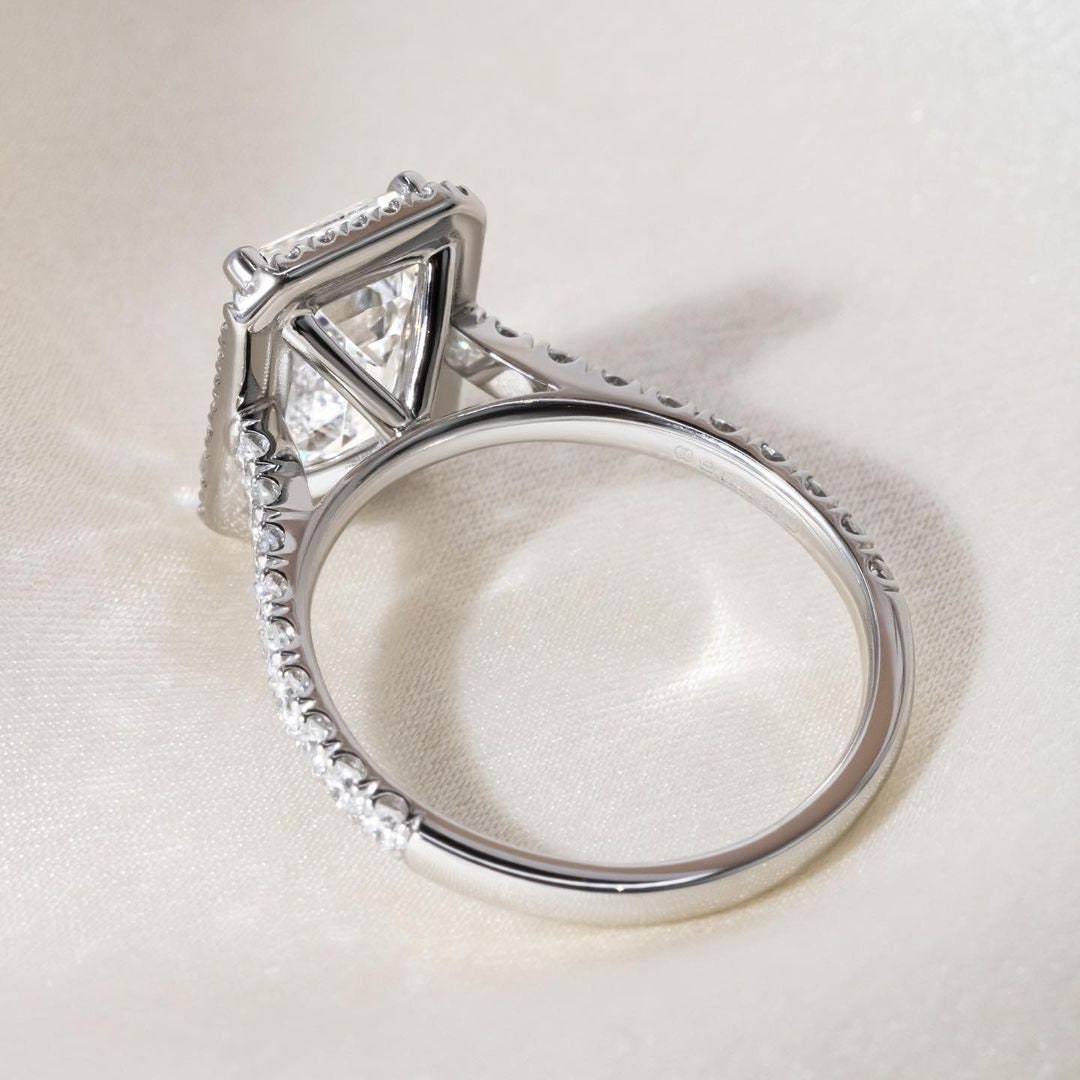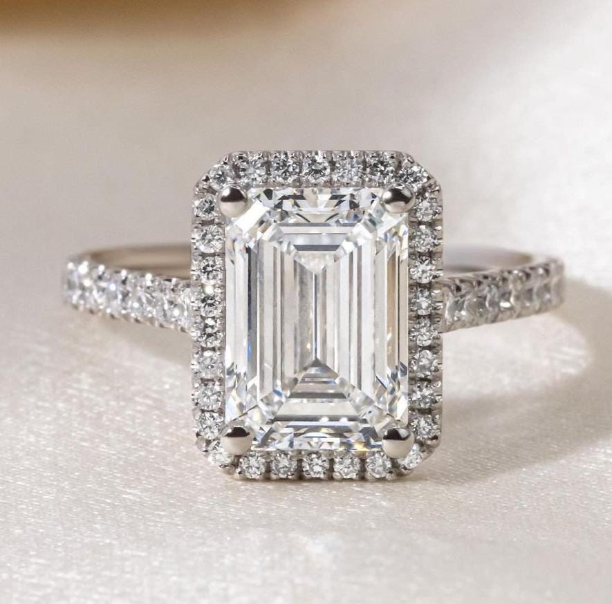 This 2.50tcw lab-grown emerald-cut diamond ring features a 2.00ct center stone with a 0.50ct round halo and pavé band. IGI certified, D-E-F color, VVS–VS clarity. Handcrafted in 10k, 14k, 18k, or platinum gold with a cathedral-style setting.