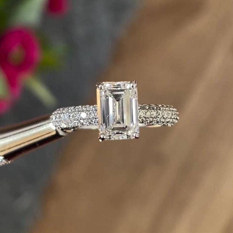 This 2.50tcw emerald-cut lab-grown diamond ring features a 1.50ct center stone, pave side diamonds, and a hidden halo. IGI certified with D-E-F color, VVS–VS clarity, set in white gold for modern elegance.