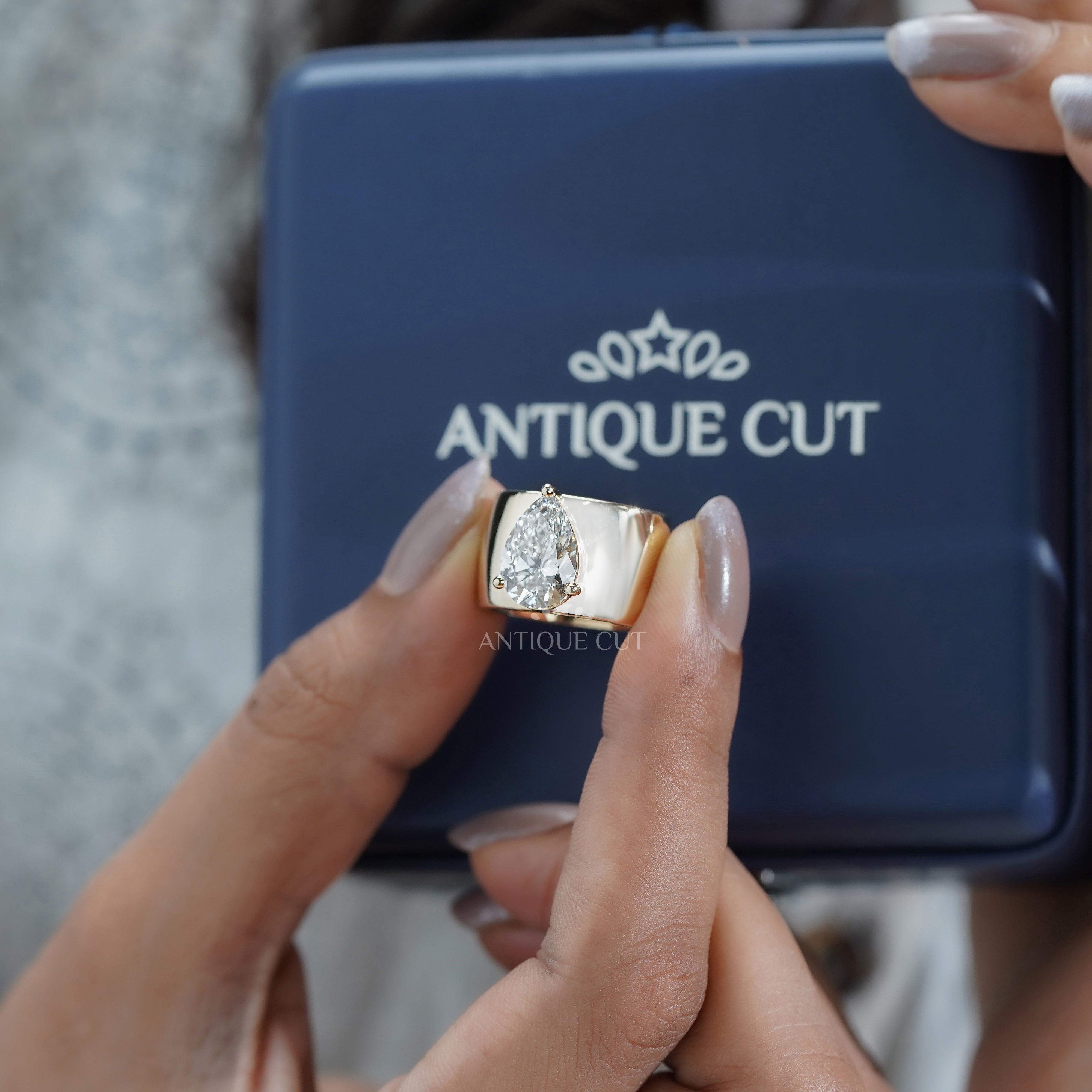 Celebrate modern elegance with this 3.00ct Pear lab-grown diamond ring set on a bold wide yellow gold band. IGI certified, ethical, and designed to make a statement.