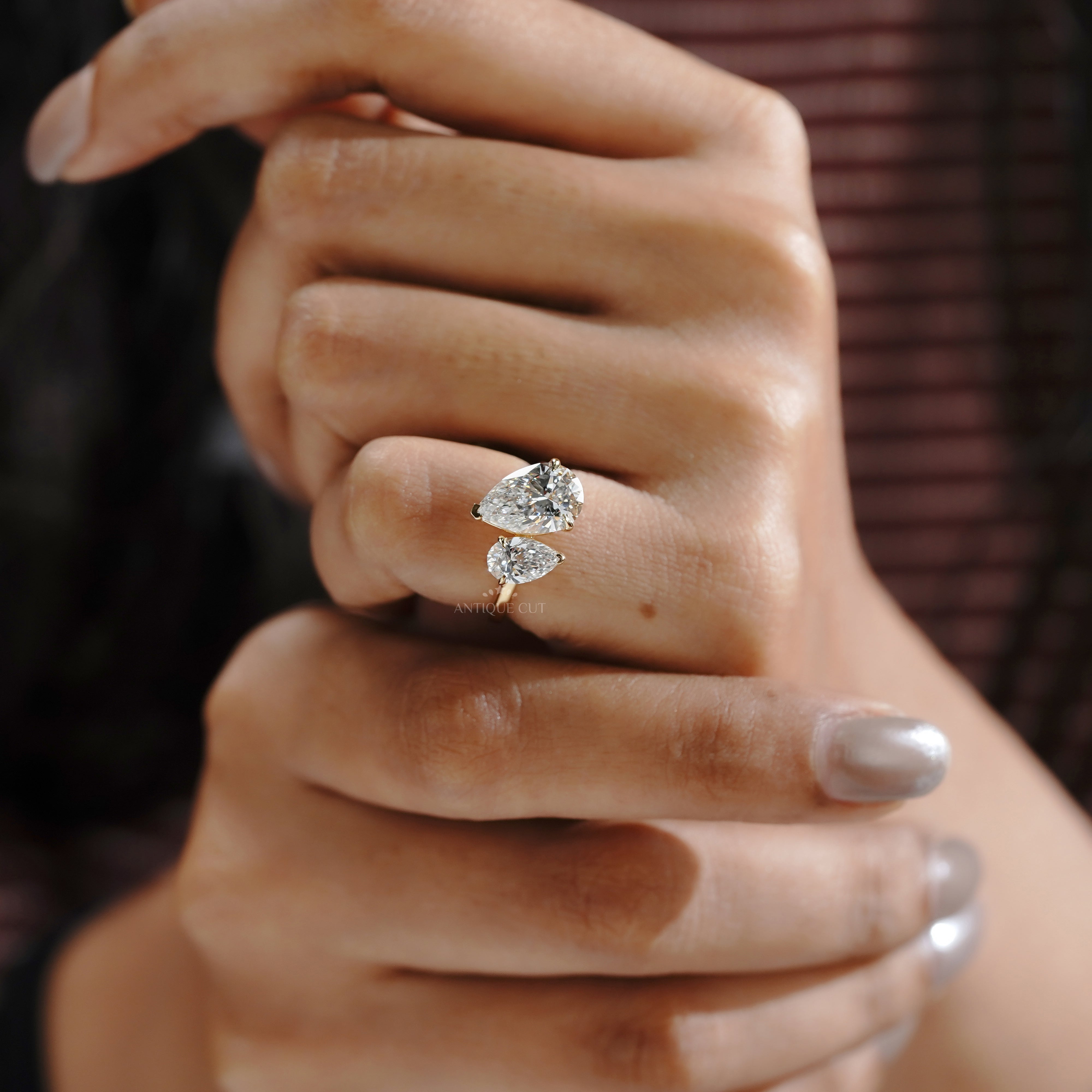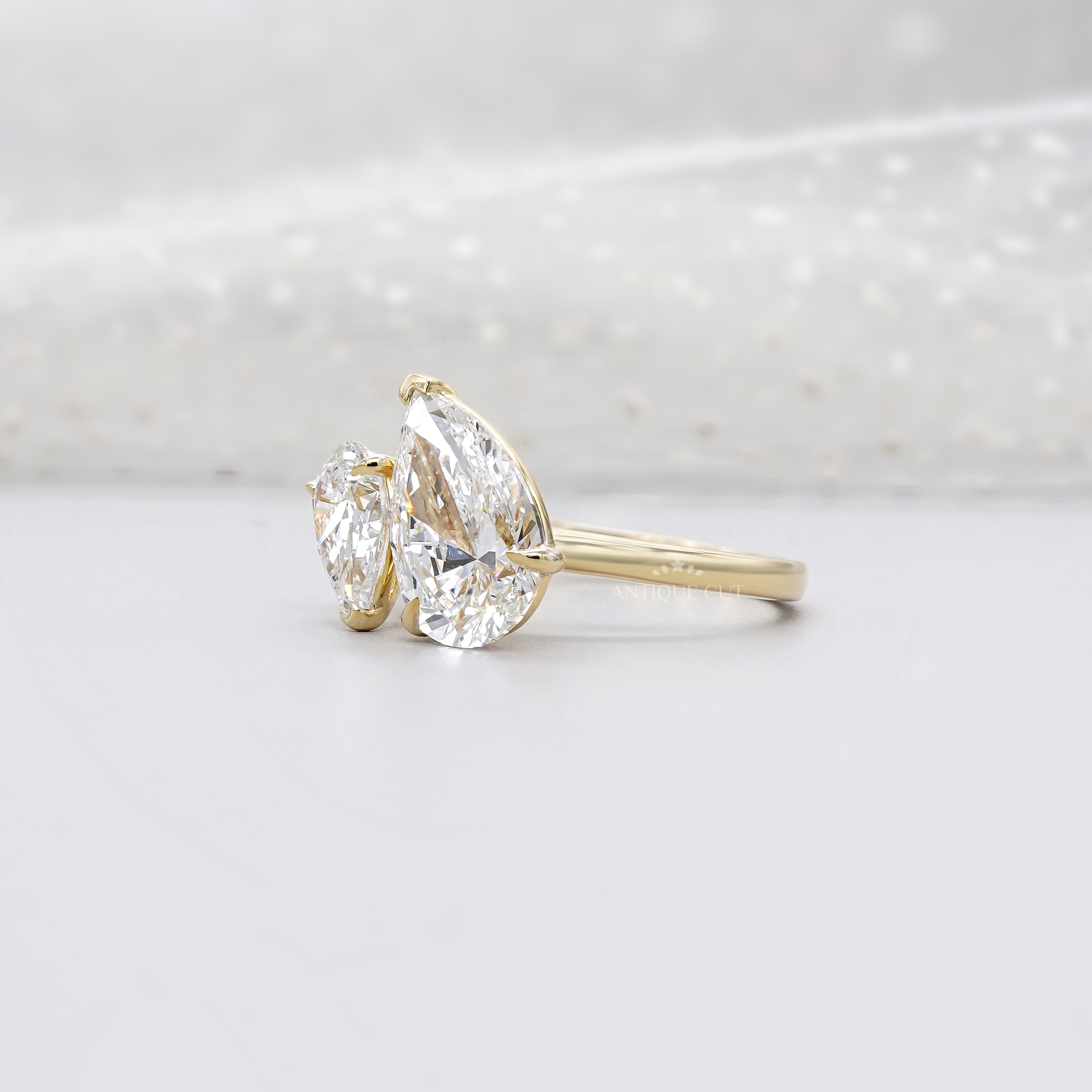 Celebrate love with this 3.10tcw Toi Et Moi lab-grown diamond ring featuring a 2.40ct pear-shaped diamond and a 0.70ct pear diamond. IGI certified, ethical, and timelessly elegant.