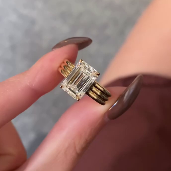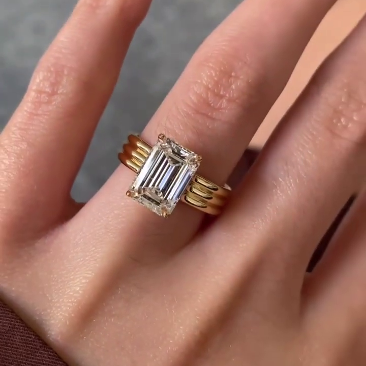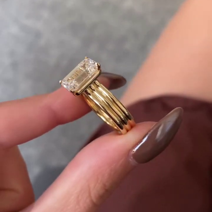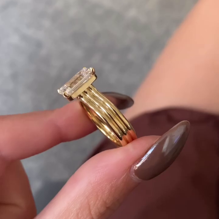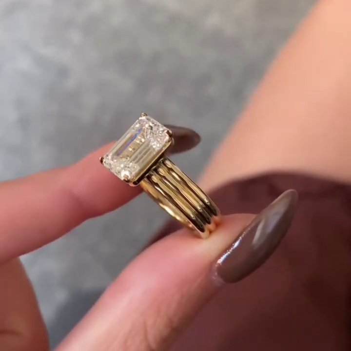 this 3.50ct Emerald Lab-Grown Diamond Ring features a modern three-rounded band in rich yellow gold. IGI certified and ethically handcrafted, this statement piece blends timeless elegance with contemporary design.