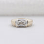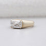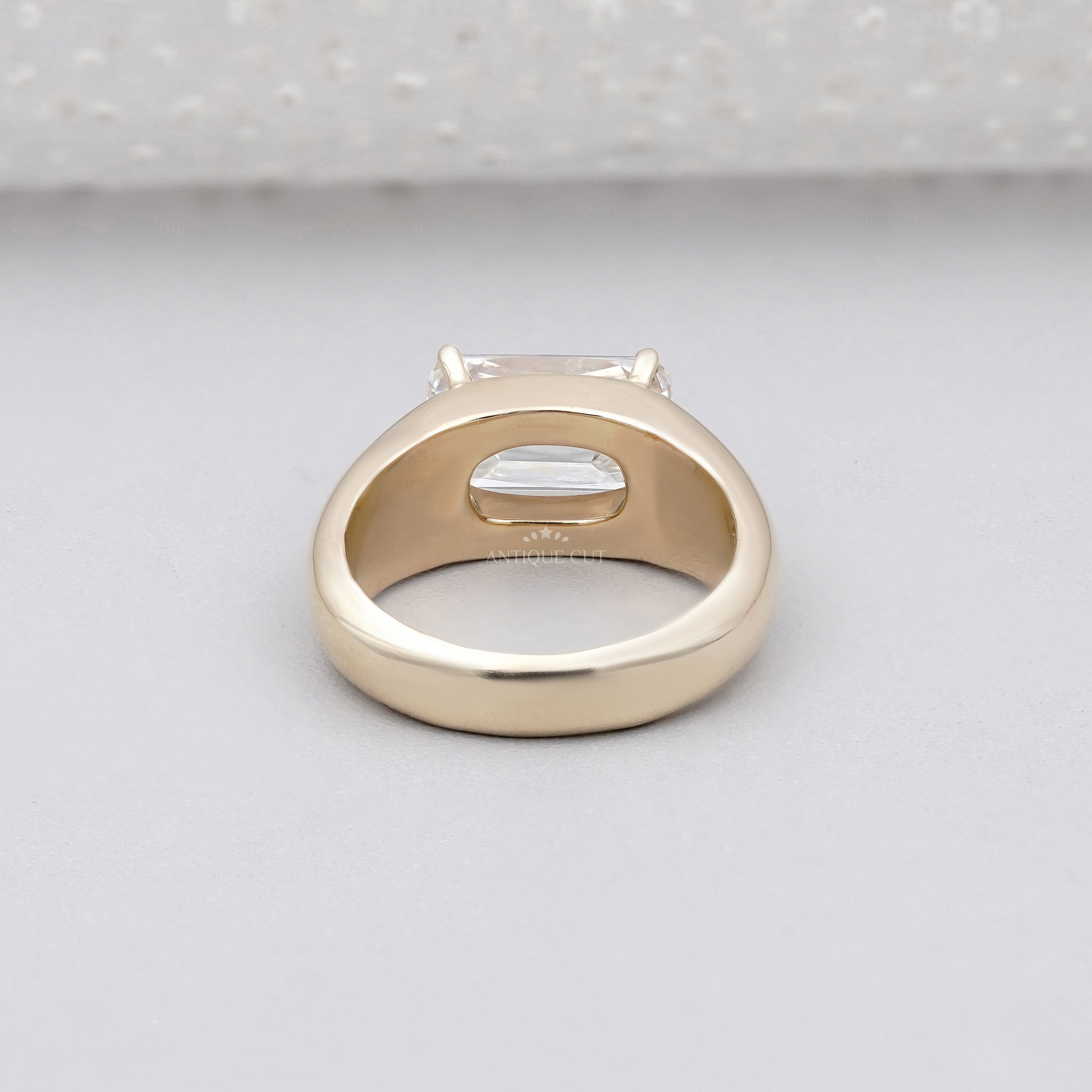 This ring features a 3.00ct cushion-cut stone set in a smooth, polished gold band. The cushion shape has a soft outline that gives the ring a refined look while keeping a strong sparkle. The setting is secure and low enough for comfortable daily wear without losing the presence of a large stone.