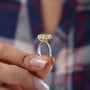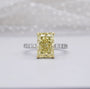 Bold and beautiful, this 4.40tcw Radiant Fancy Yellow Lab Diamond Ring features a dazzling hidden halo and pavé band. Set in white gold, it combines luxury with sustainable craftsmanship. A stunning choice for modern elegance and timeless charm. IGI Certified.