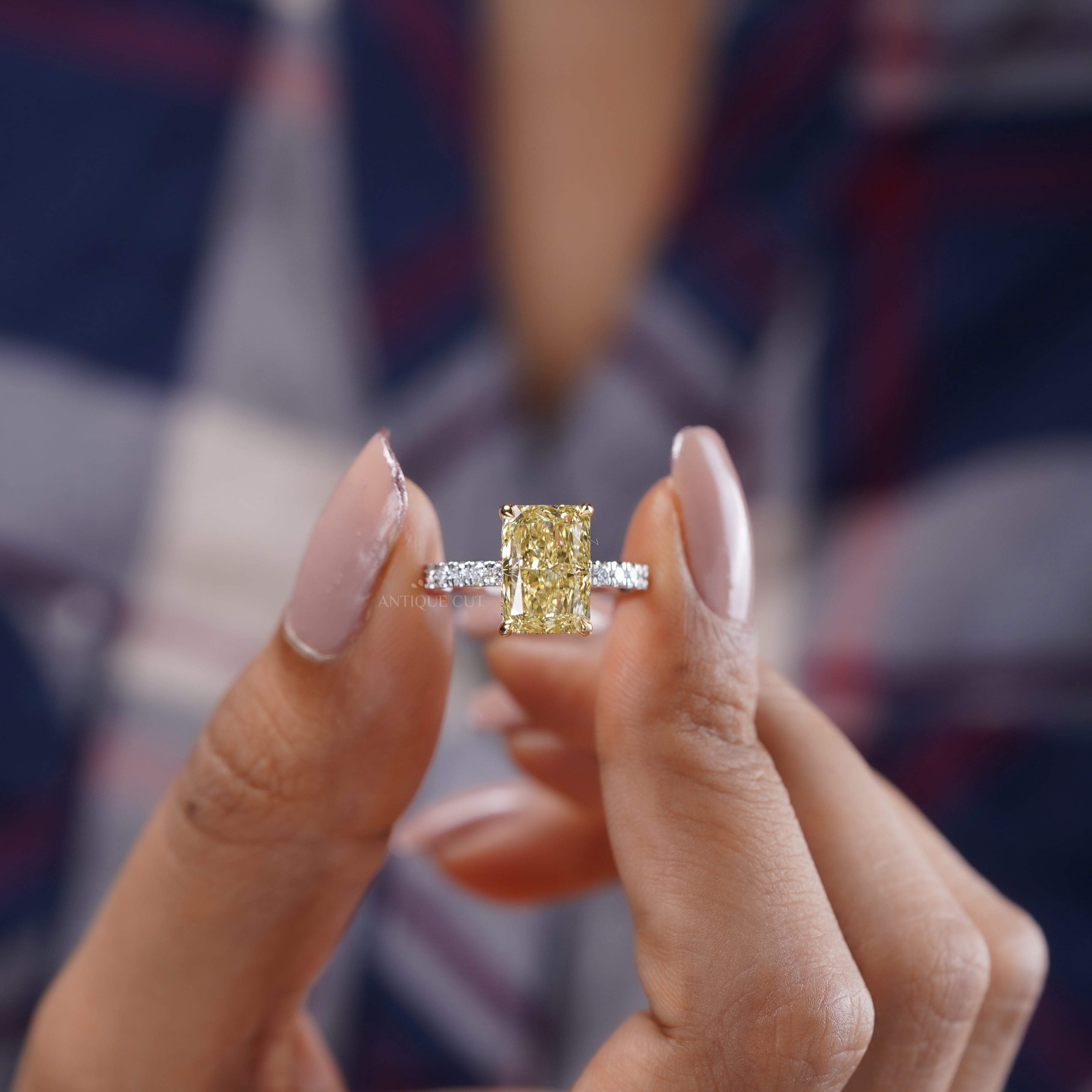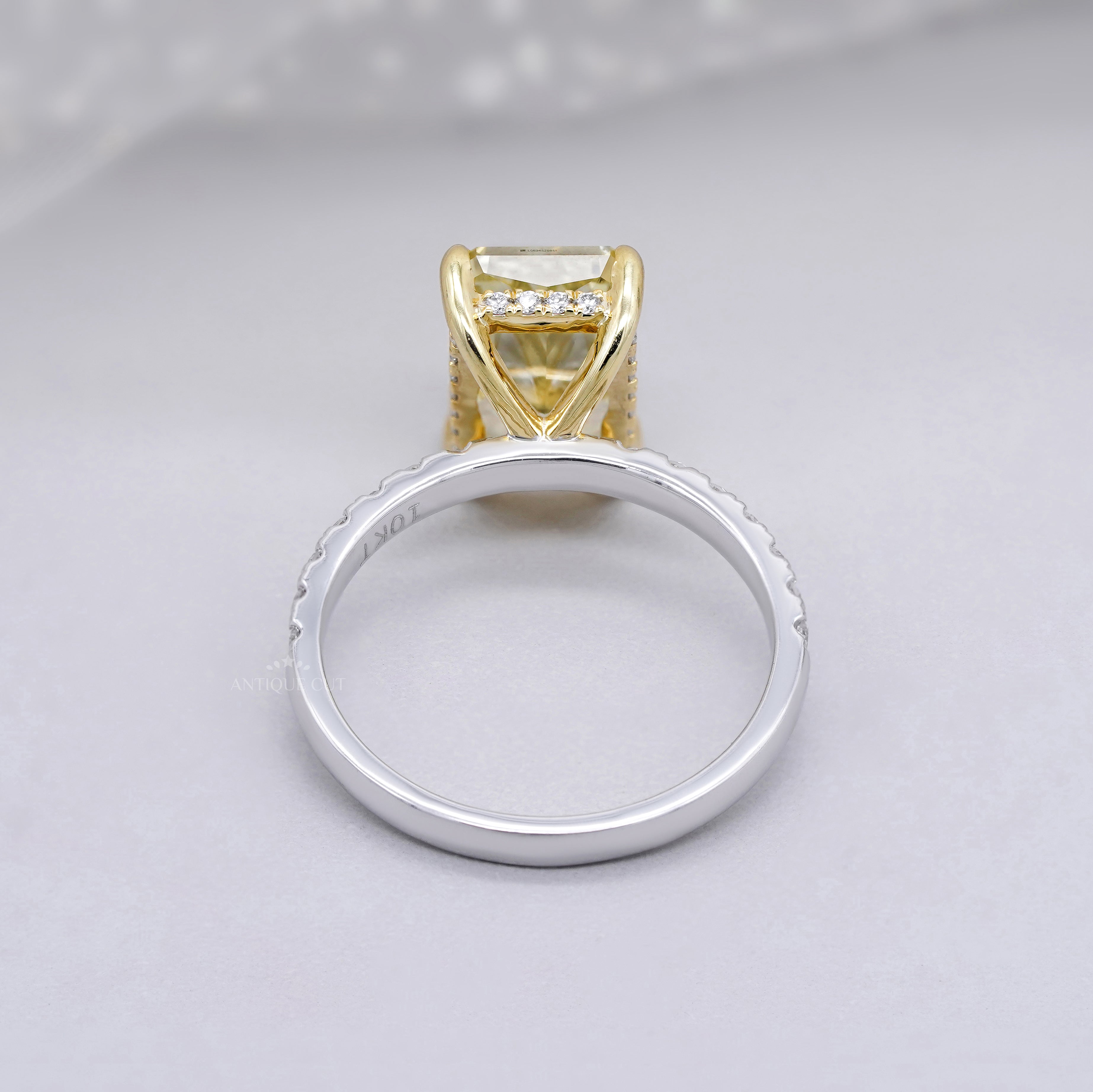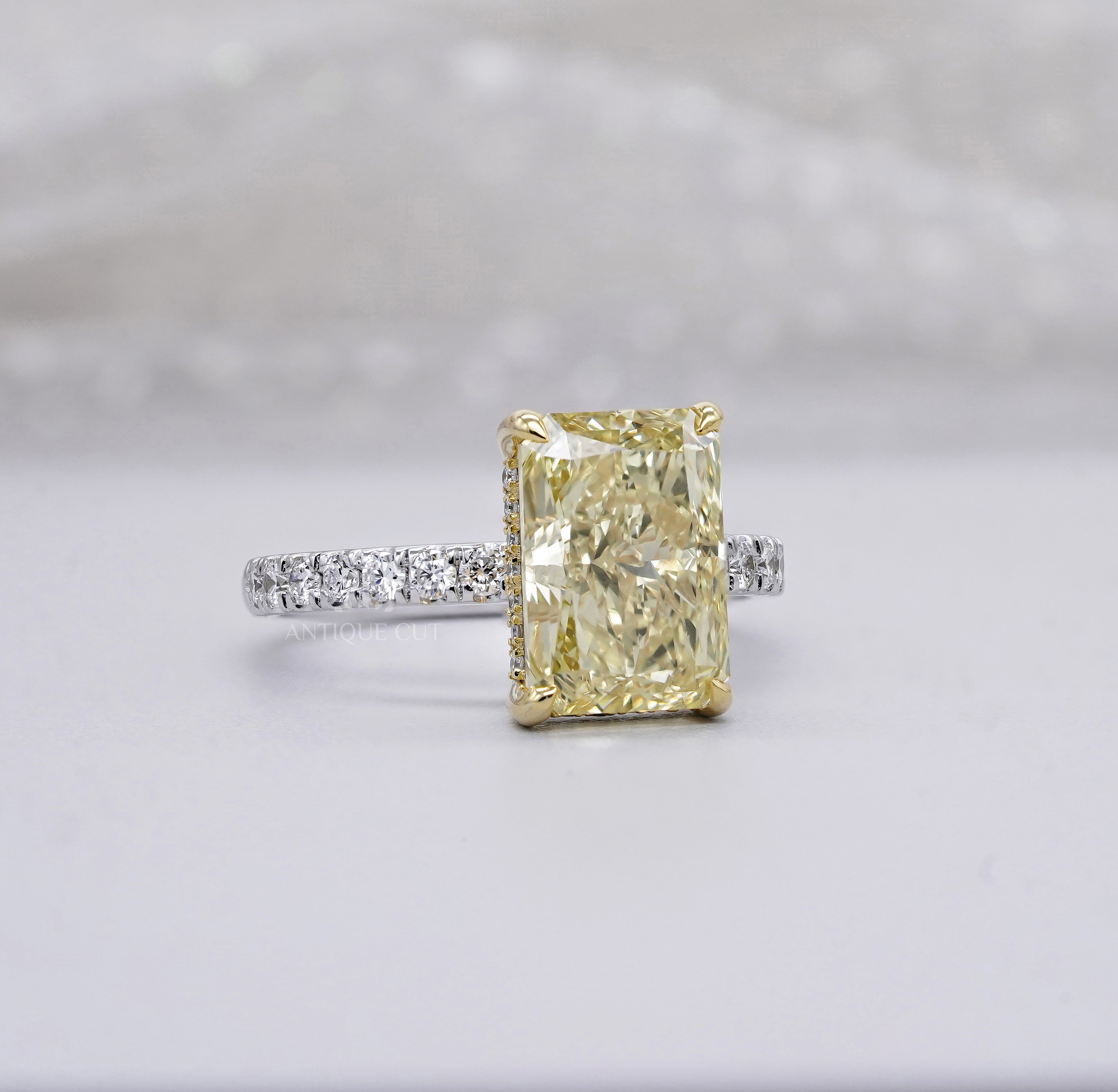 4.40ct Radiant Fancy Yellow Lab Diamond Ring with Hidden Halo & Two Tone Pavé Band