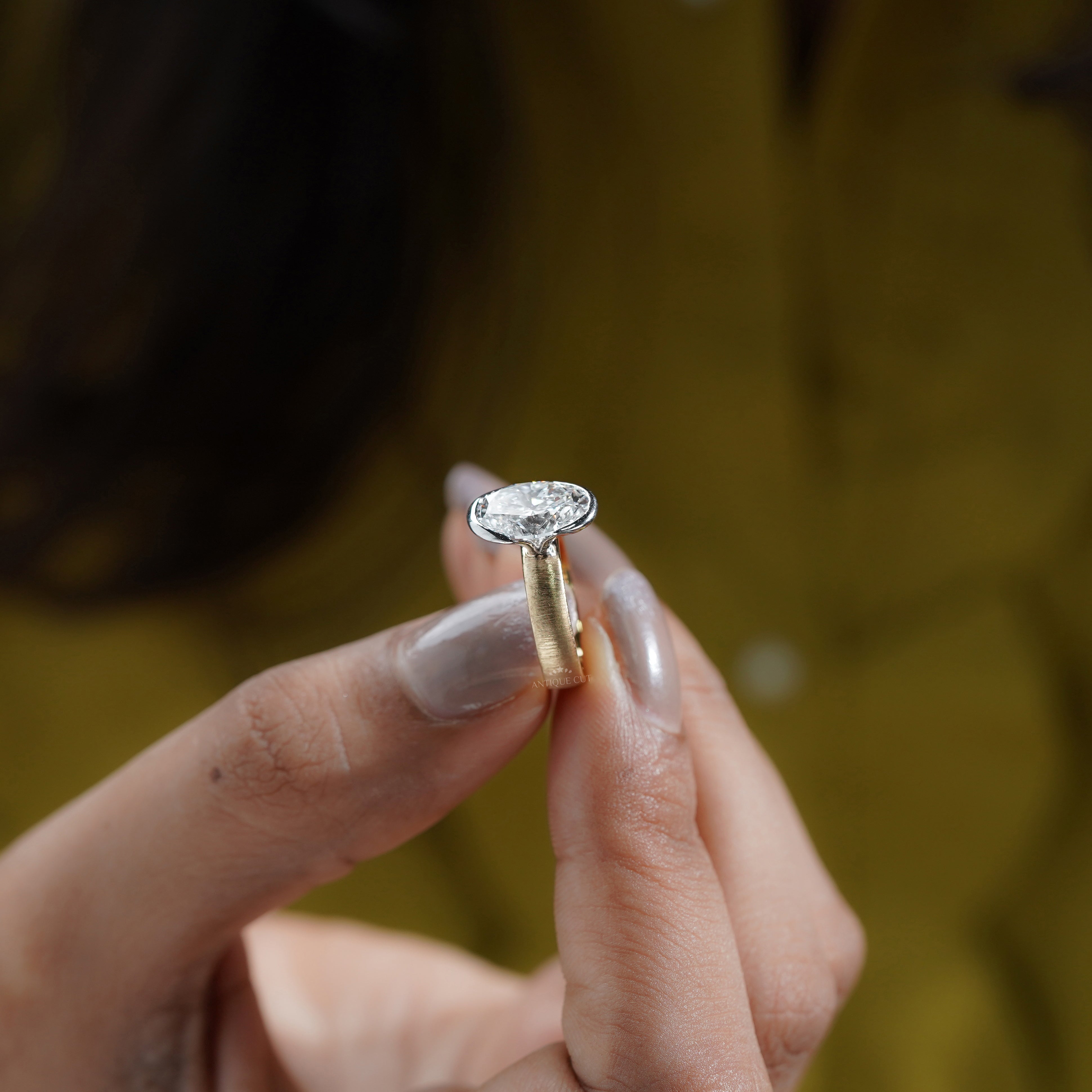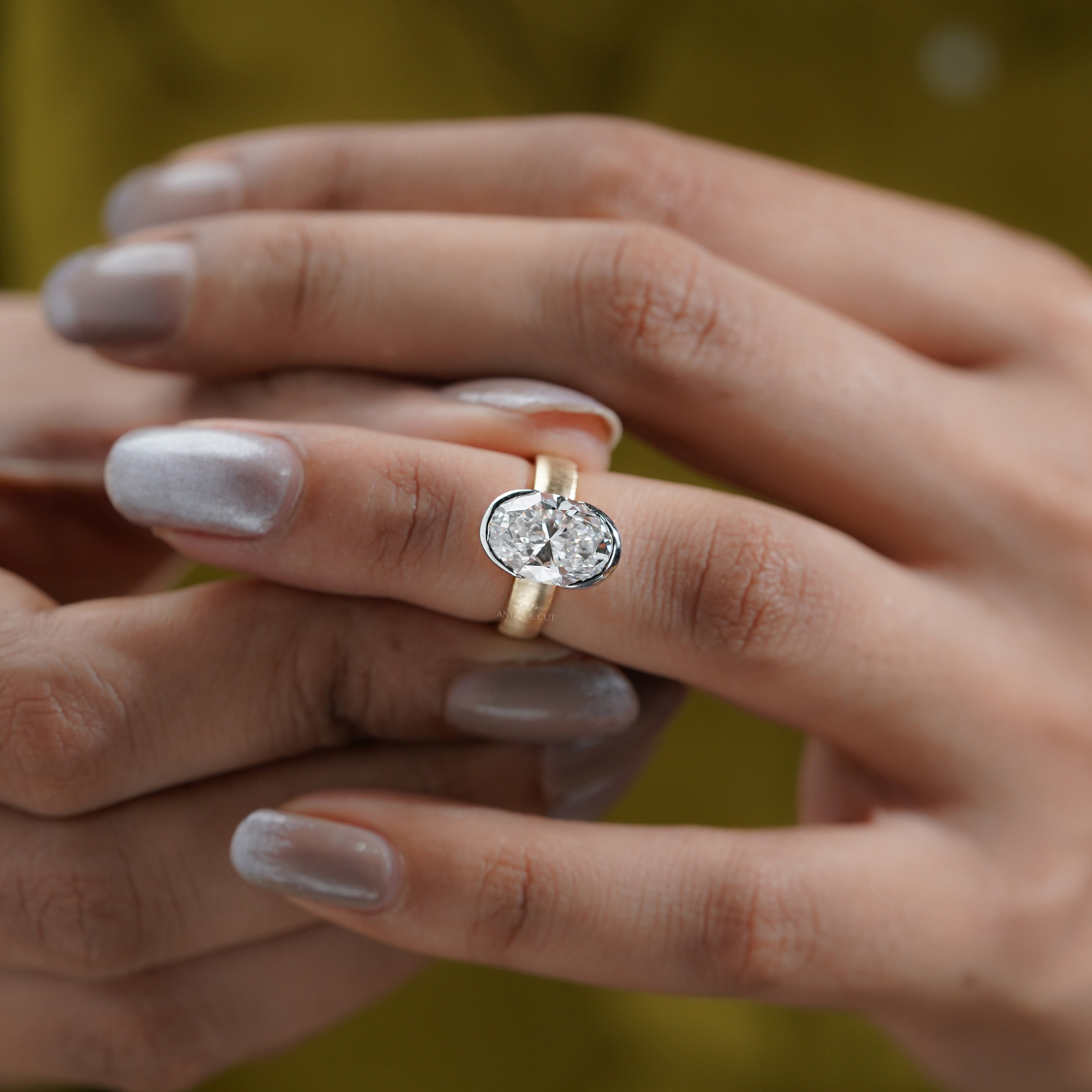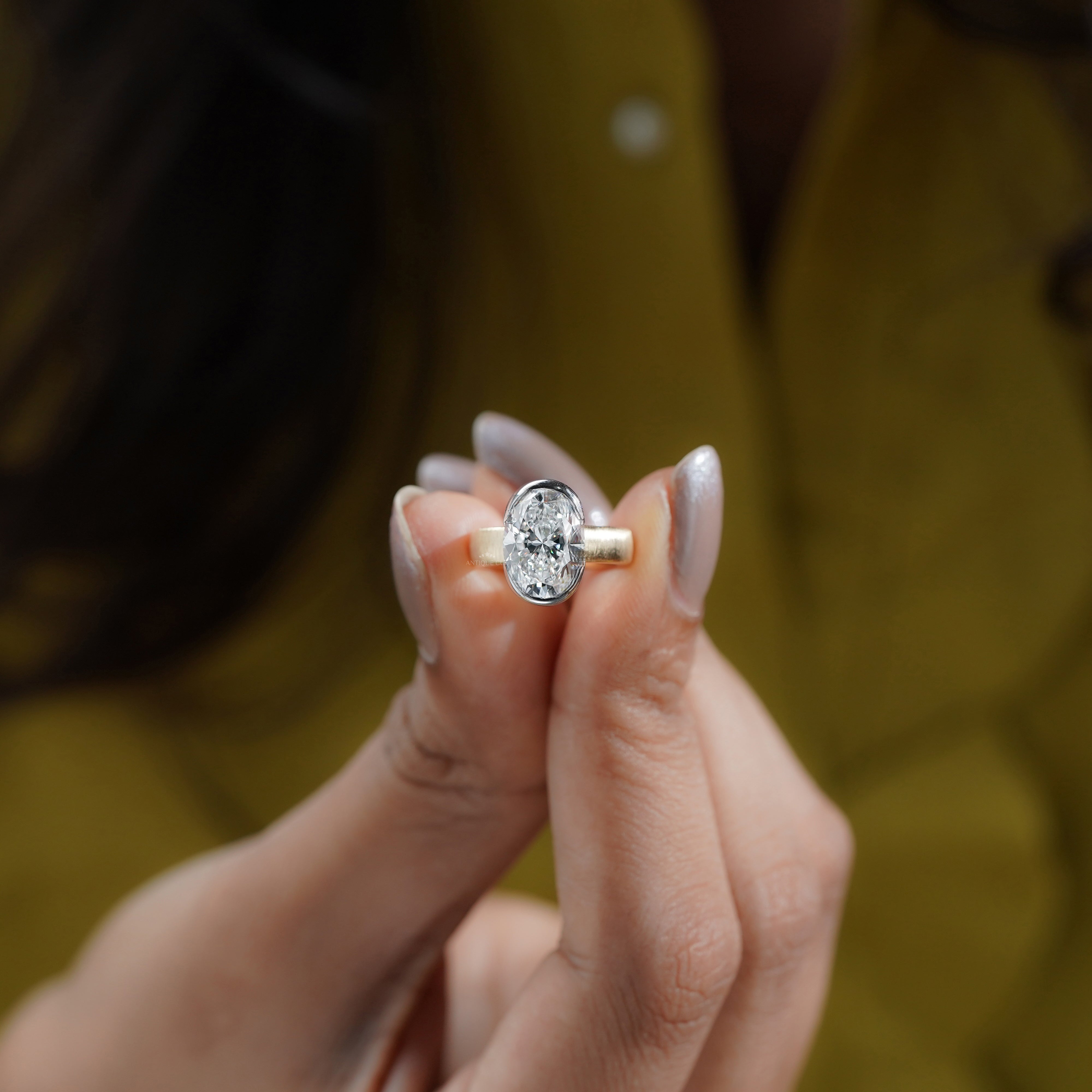 4ct Oval Lab Grown Diamond Bezel Engagement Ring | Two-Tone Matte Finish | IGI Certified D-E-F VVS–VS