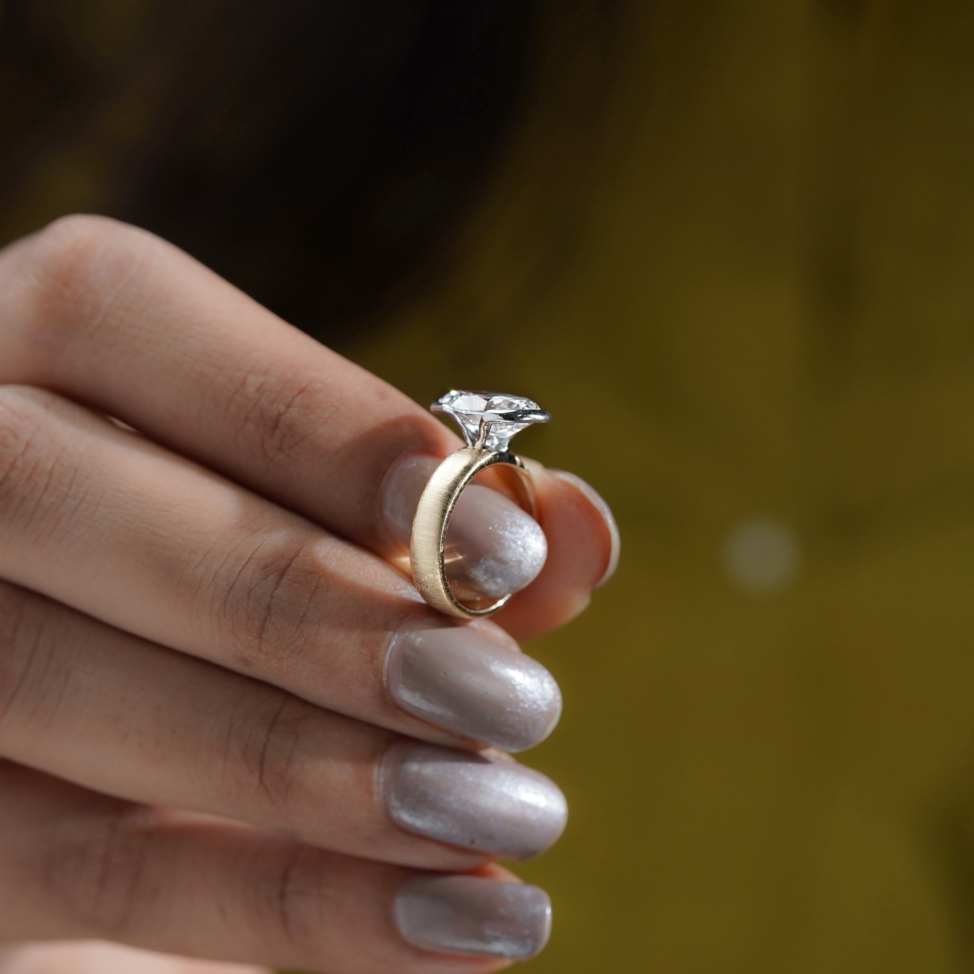 Celebrate your love with this 4.00ct Oval Lab-Grown Diamond Bezel Engagement Ring, designed with a modern two-tone matte finish. Featuring a bold 4.00ct oval center diamond in DEF color and VVS–VS clarity, securely bezel-set in polished white gold on a brushed yellow gold band. IGI certified, ethical, and handcrafted, this ring blends contemporary style with timeless elegance.