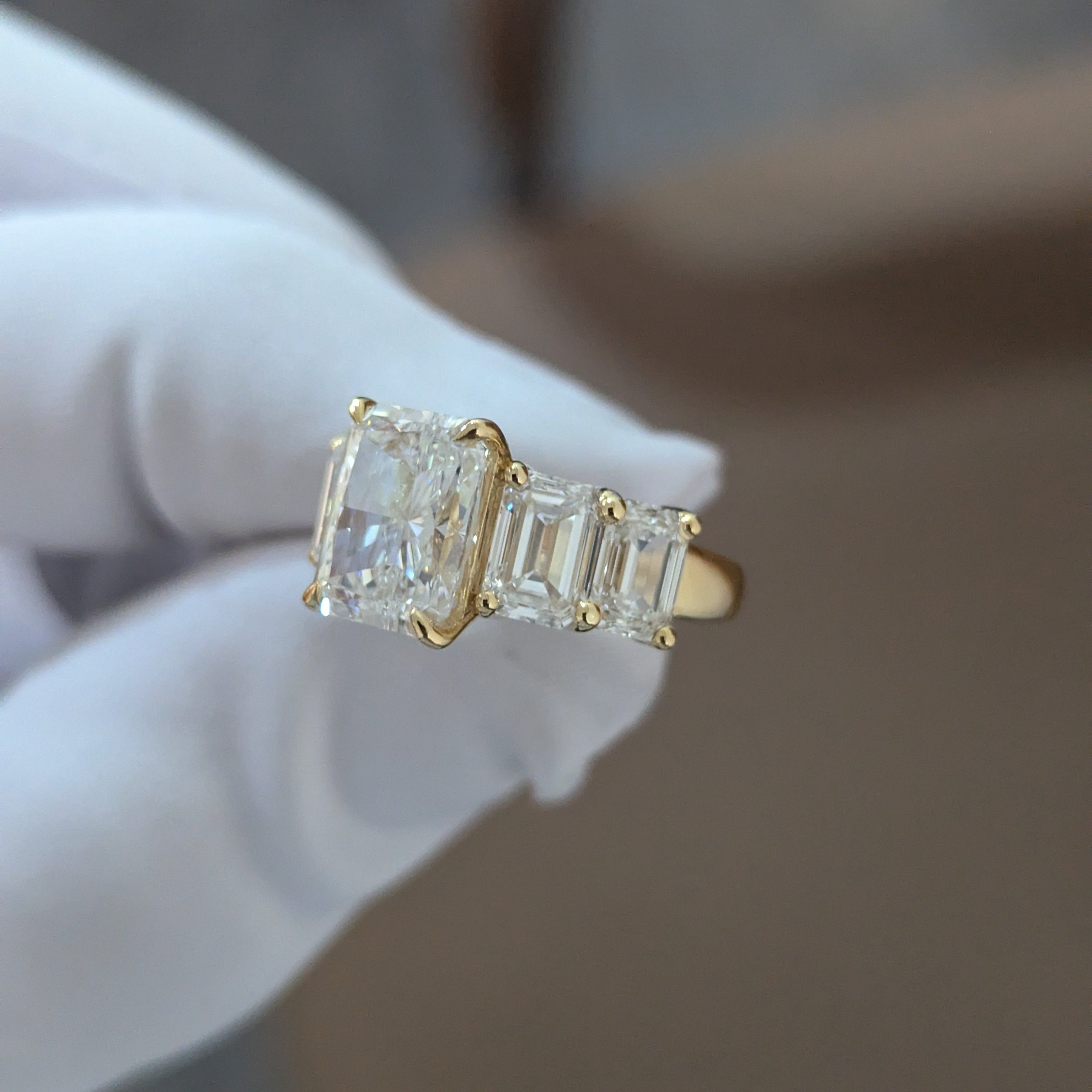 • Total 6.50tcw with radiant center and emerald side diamonds
