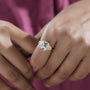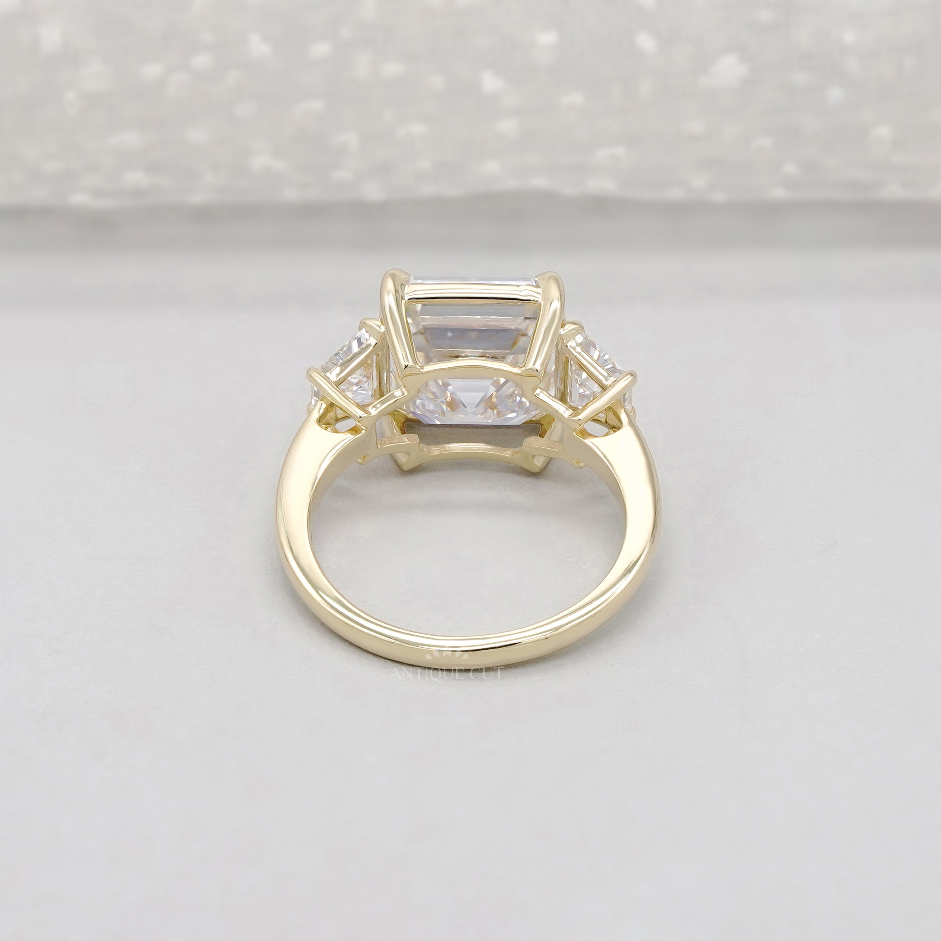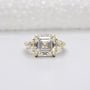 – Three-stone design with a bold Asscher center