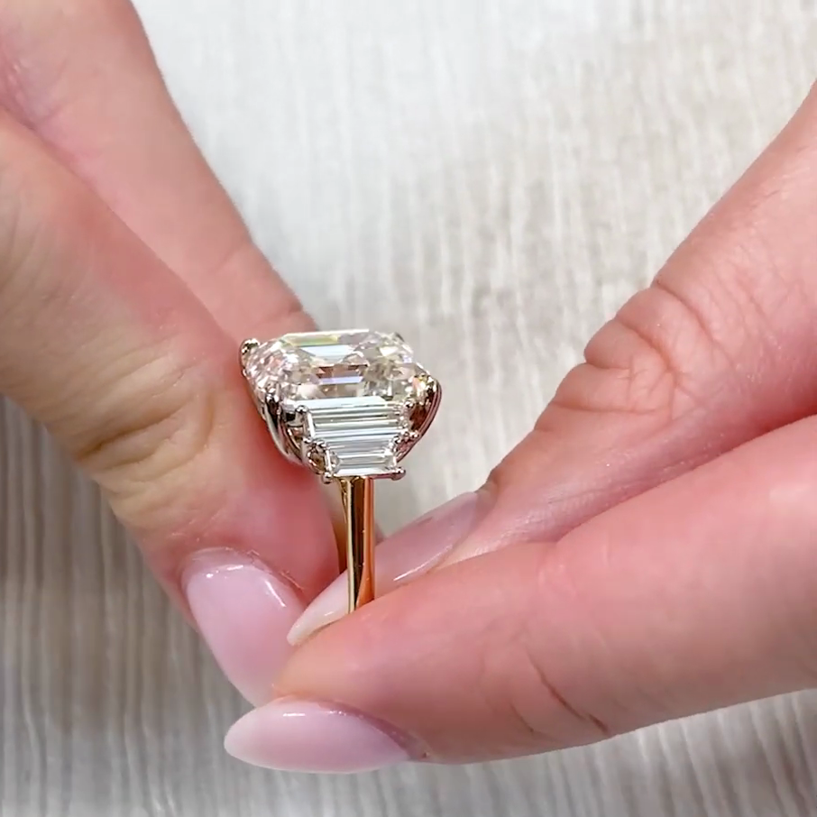 This 9.50tcw Asscher-cut lab-grown diamond five-stone engagement ring showcases a bold 8.50ct center with baguette side stones in 10k/14k/18k white gold. IGI certified, DEF color, and VVS–VS clarity — a breathtaking, ethical masterpiece for your forever moment.