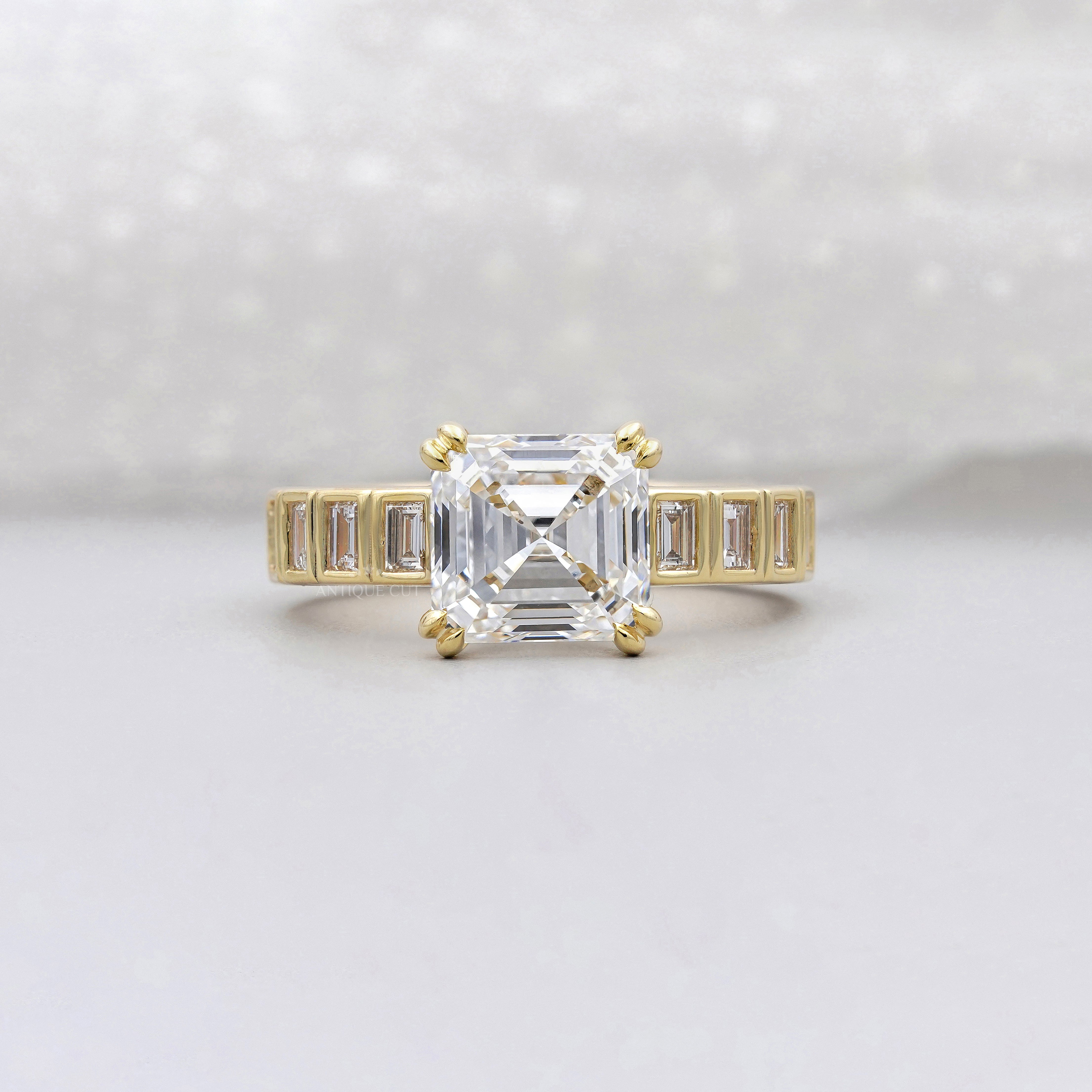 Asscher Cut 5.50tcw Lab Grown Diamond Engagement Ring | Yellow Gold Channel Set | IGI Certified