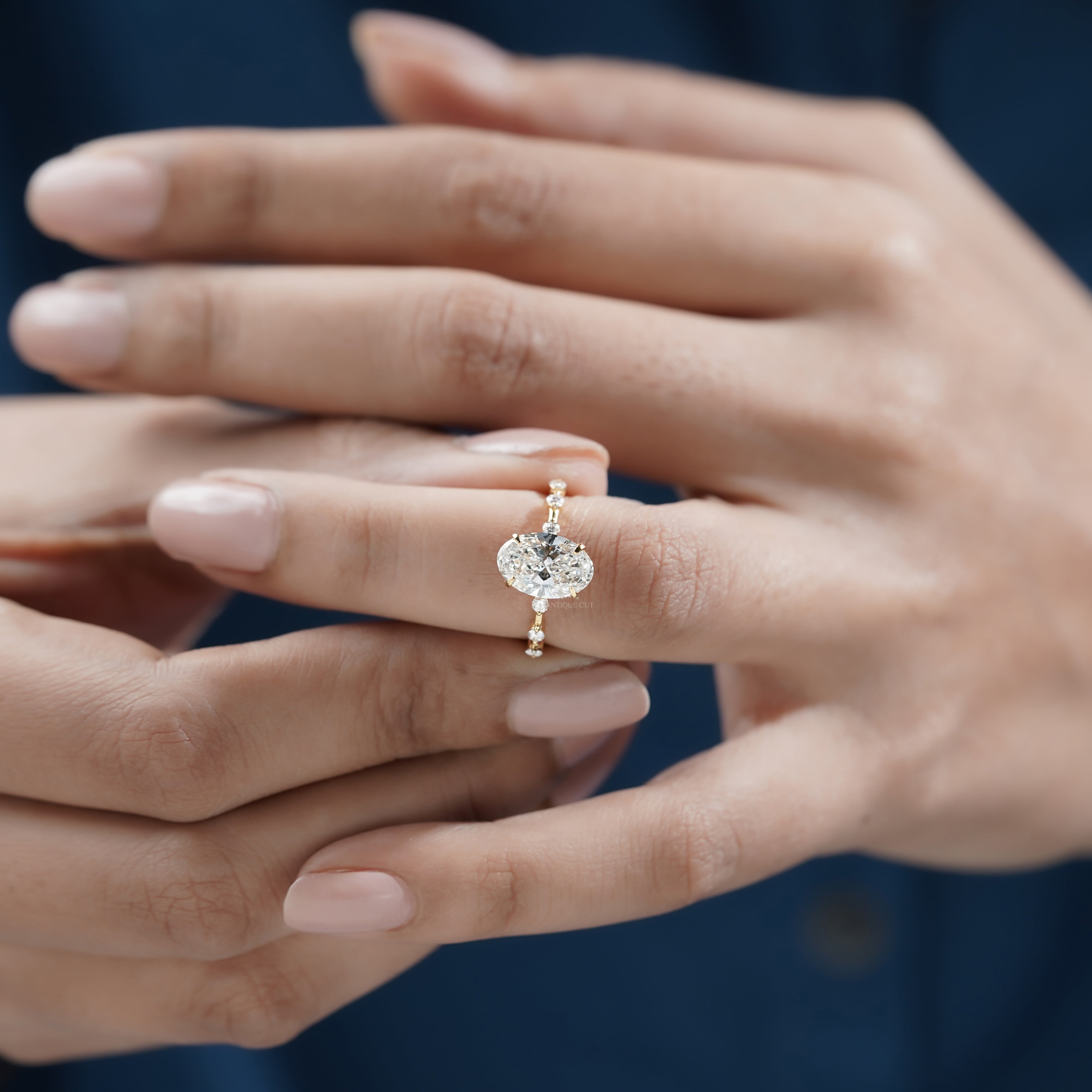 Features a 3.00ct oval center diamond with sparkling side stones, crafted in a sleek prong setting.