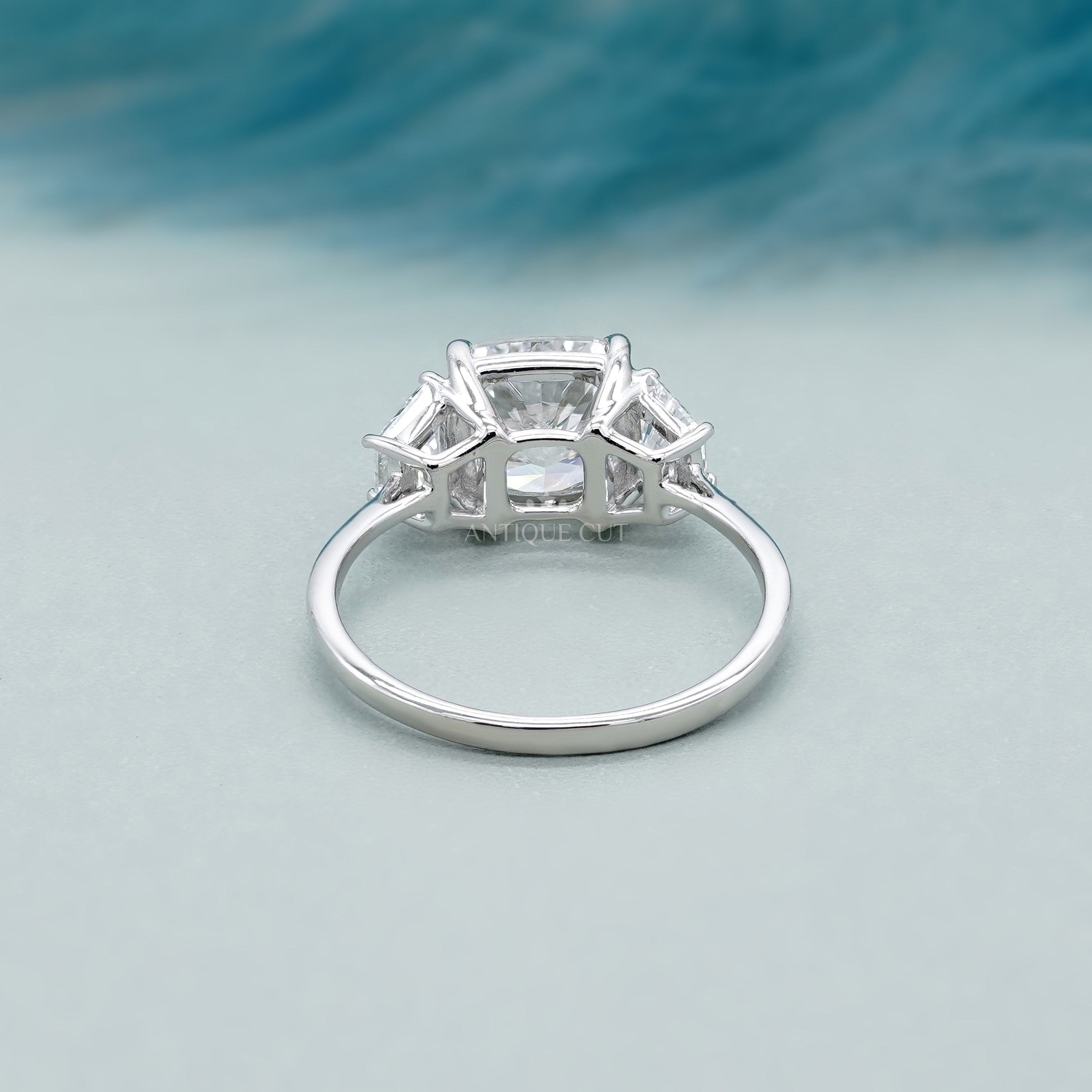 ✓ Classic 3.00tcw three-stone cushion-cut design