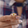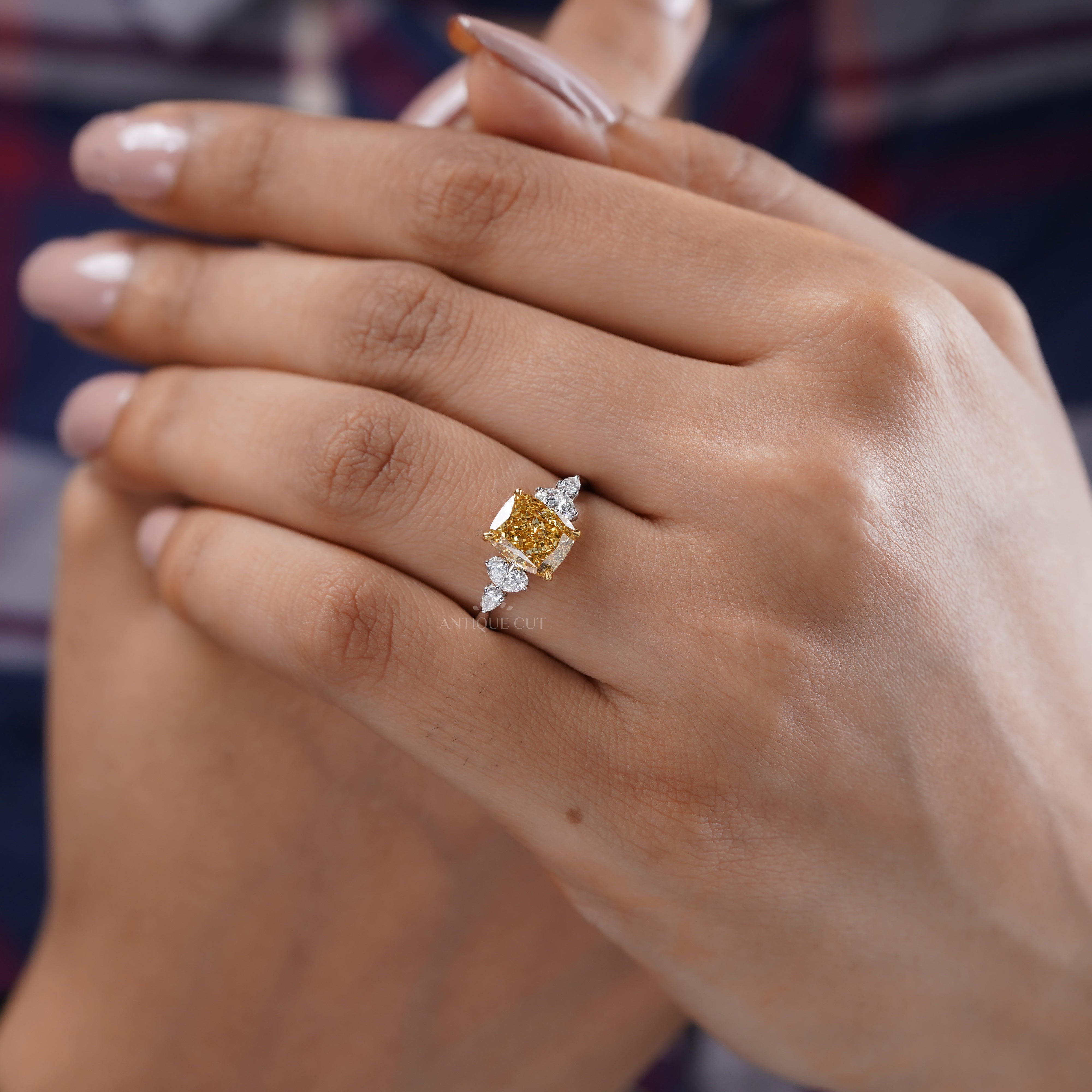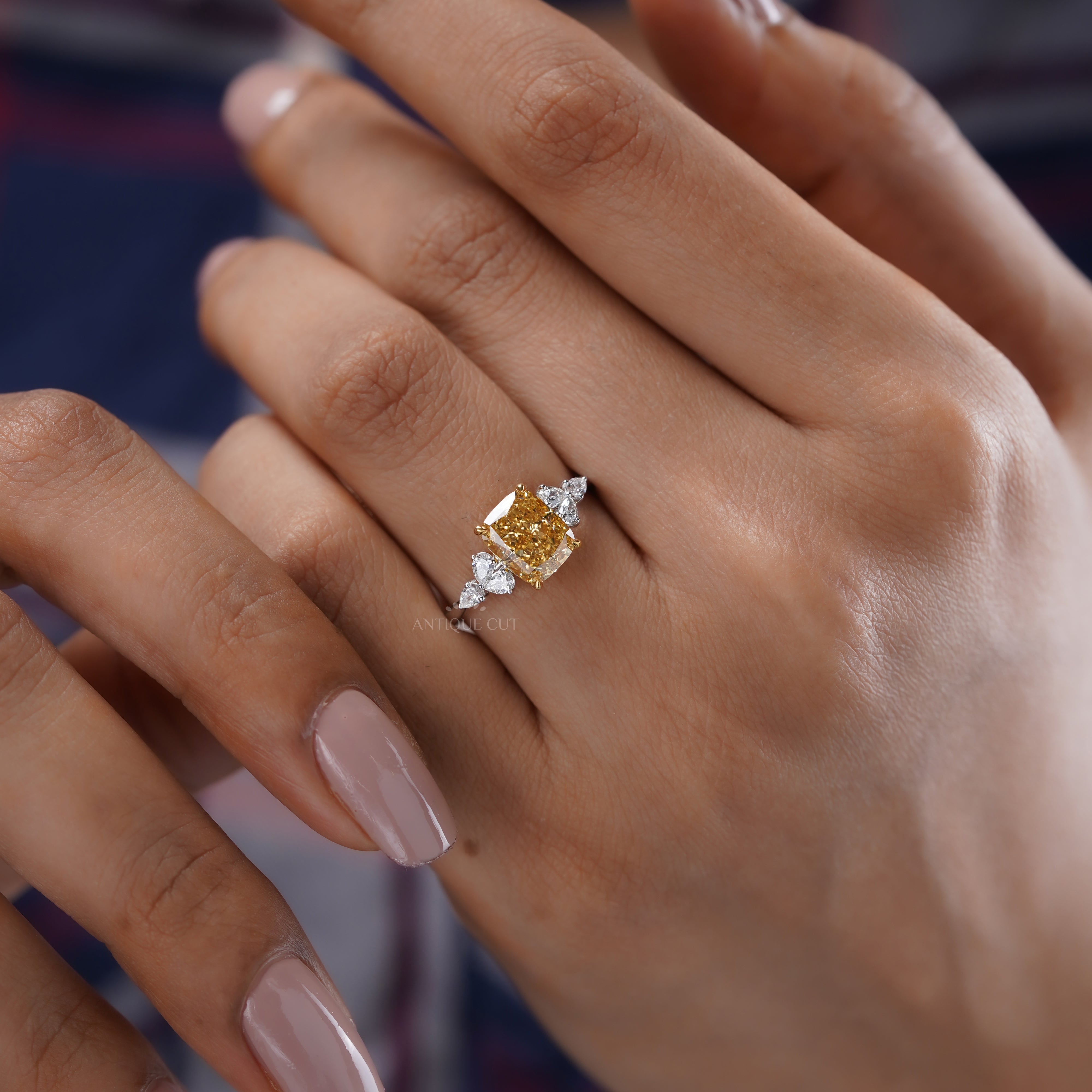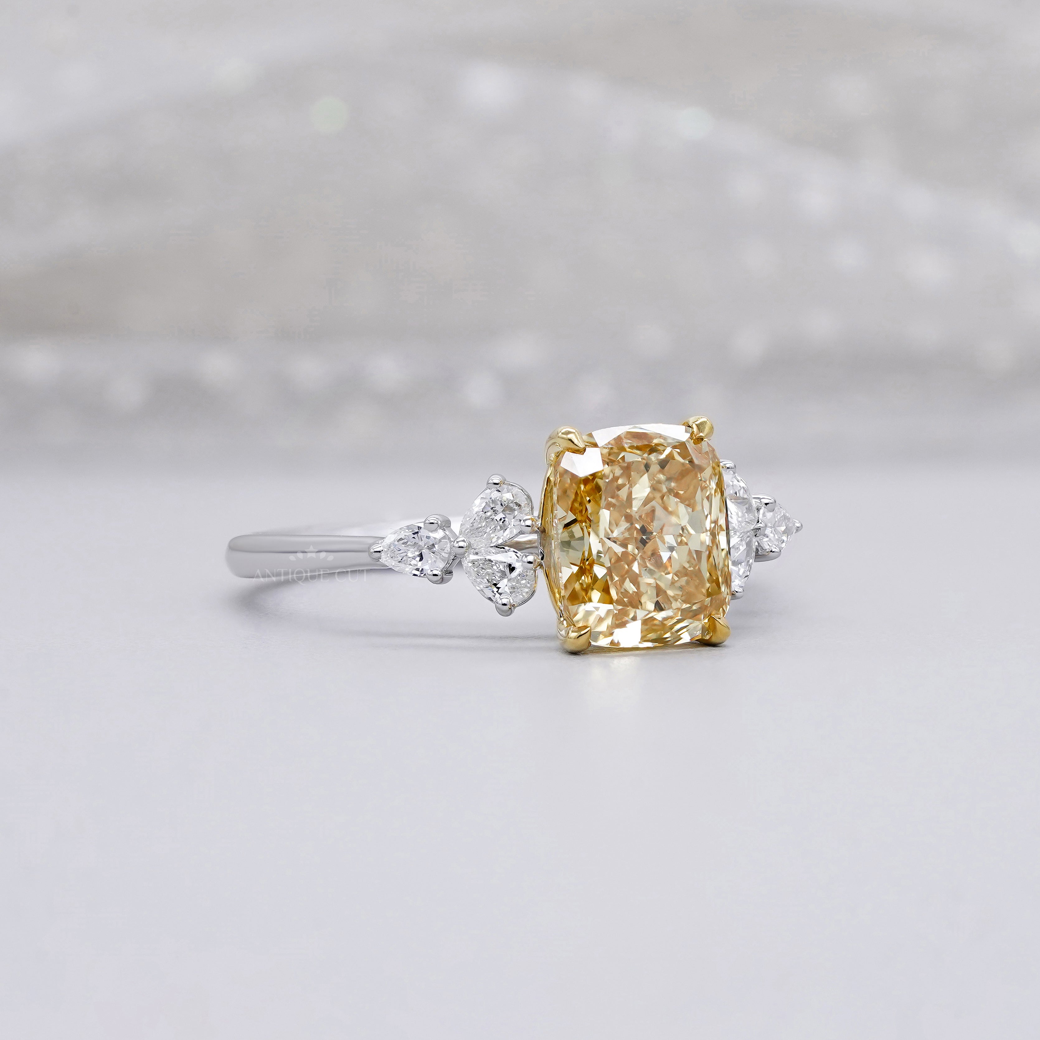 Elegant 3.20tcw Cushion Lab Diamond Ring featuring a 2.50ct Fancy Yellow cushion-cut center and 0.70ct white pear side stones. IGI certified and handcrafted in solid 10k/14k/18k gold. A bold, balanced sparkle that combines timeless beauty with ethical values.