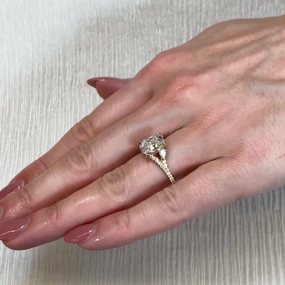 This 4.00tcw Cushion-cut lab-grown diamond engagement ring features a bold 3.00ct center paired with pear and round side stones on a modern split band in 10k/14k/18k white gold. IGI certified, DEF color, and VVS–VS clarity — a stunning, ethical choice with contemporary flair.