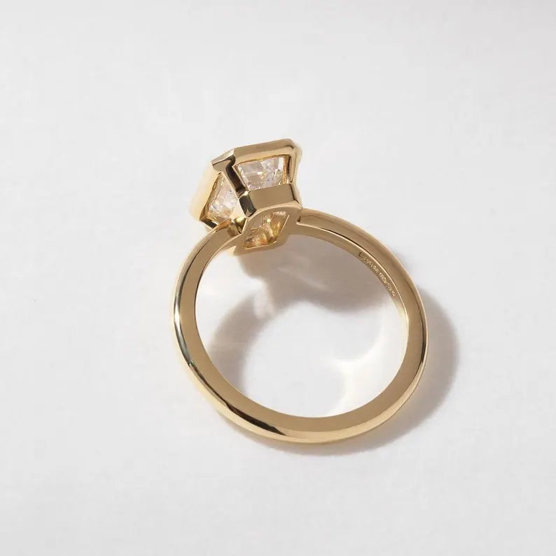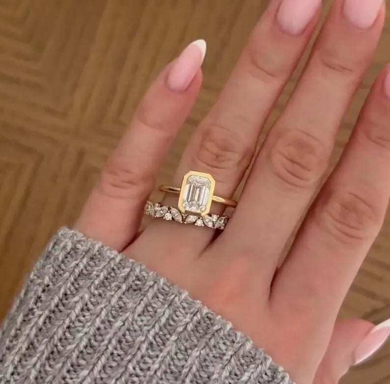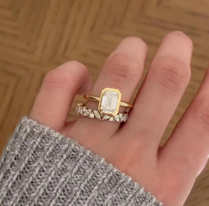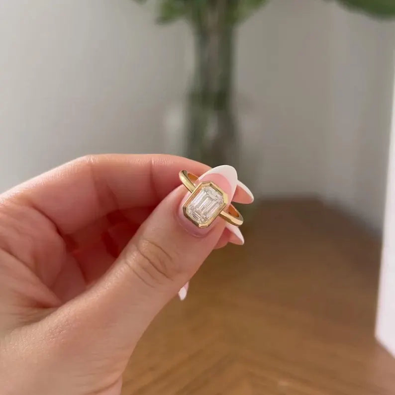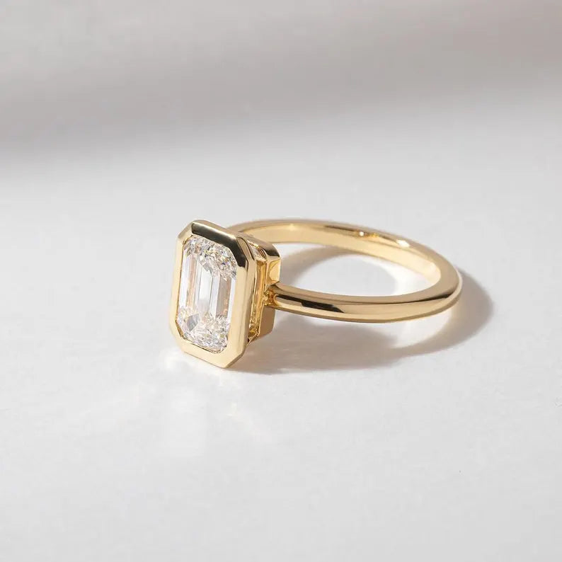 This 2.00ct emerald-cut lab-grown diamond engagement ring features a sleek basket bezel setting in 10k, 14k, or 18k yellow gold. IGI certified, DβEβF color, VVSβVS clarity. Elegant, ethical, and fully customizable for timeless beauty.