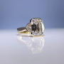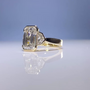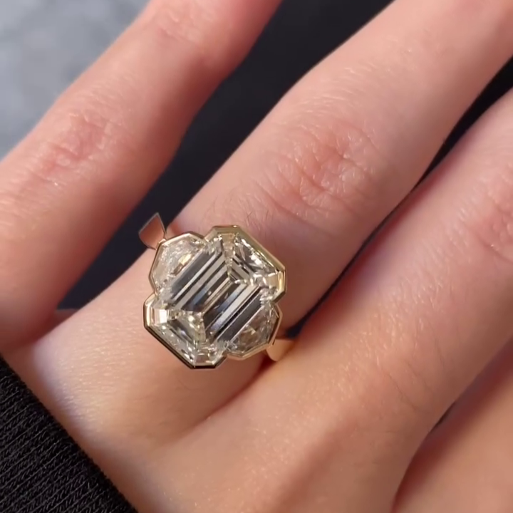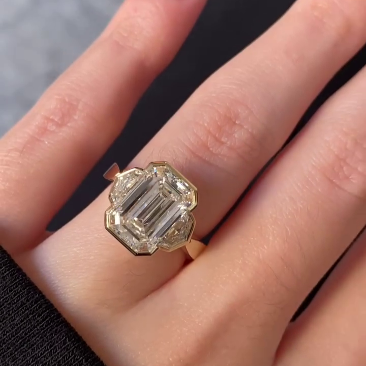This 2.60tcw lab-grown diamond engagement ring showcases a bold 2.00ct emerald-cut center with 0.60ct half-moon side stones, bezel-set in 10k/14k/18k yellow gold. IGI certified, DEF color, VVS–VS clarity — a modern, sustainable, and elegant choice.