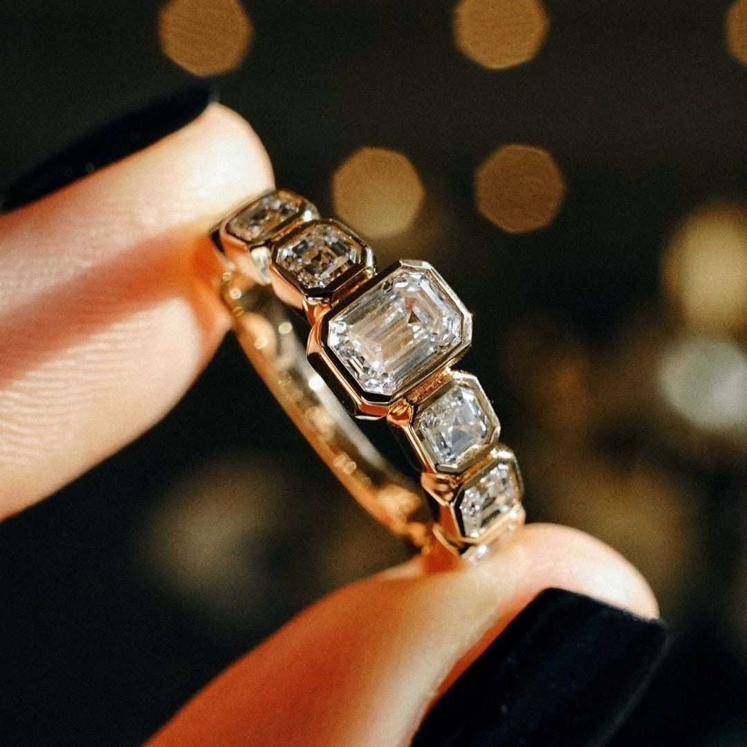 Elegant and bold, this 3.00tcw lab-grown diamond engagement ring features a 1.00ct emerald-cut center and 2.00tcw Asscher side stones in a sleek bezel setting. Ethically made and IGI-certified.
