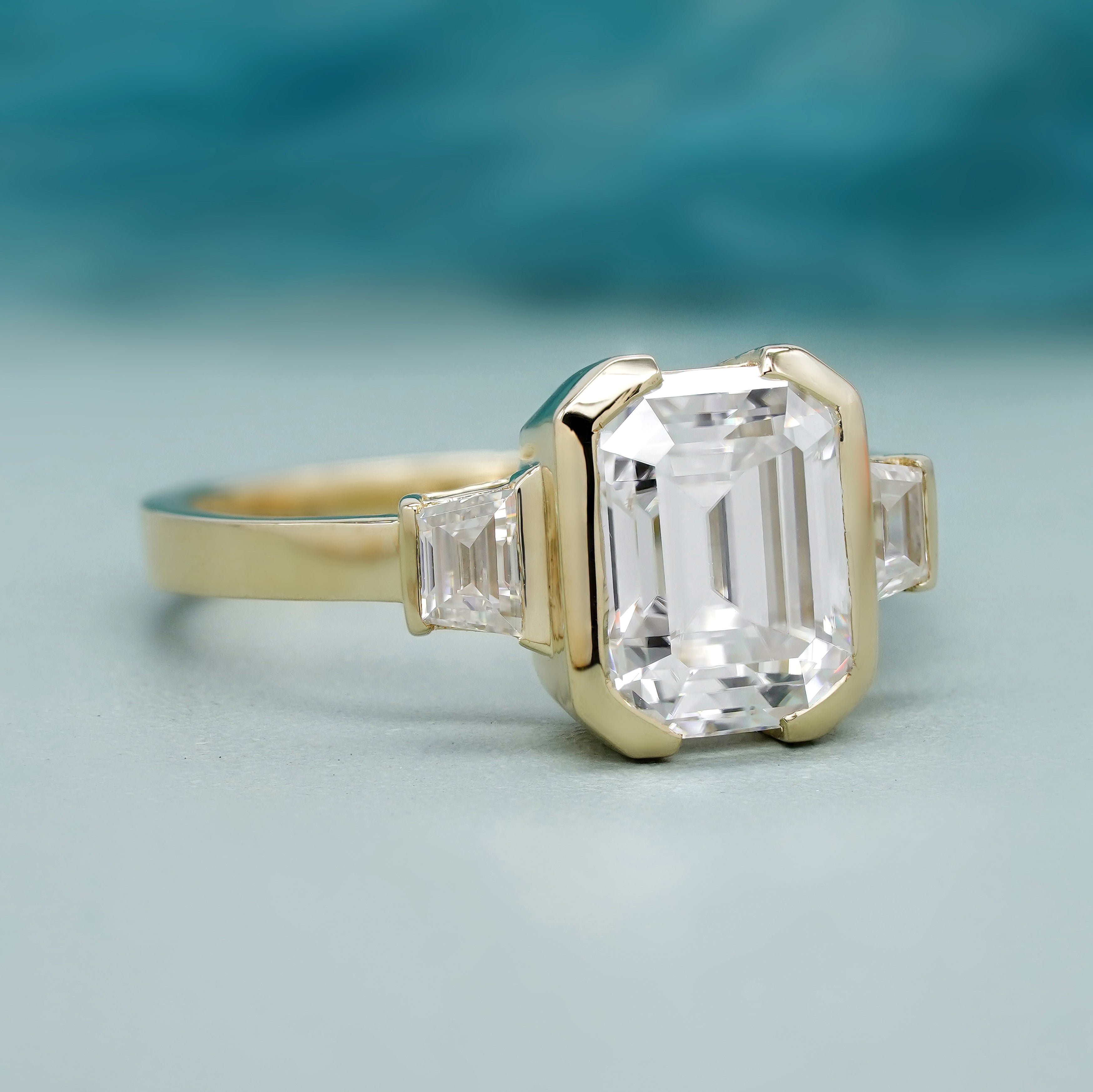 ✓ 3.00ct emerald-cut center + 1.00ct trapezoid side stones