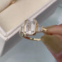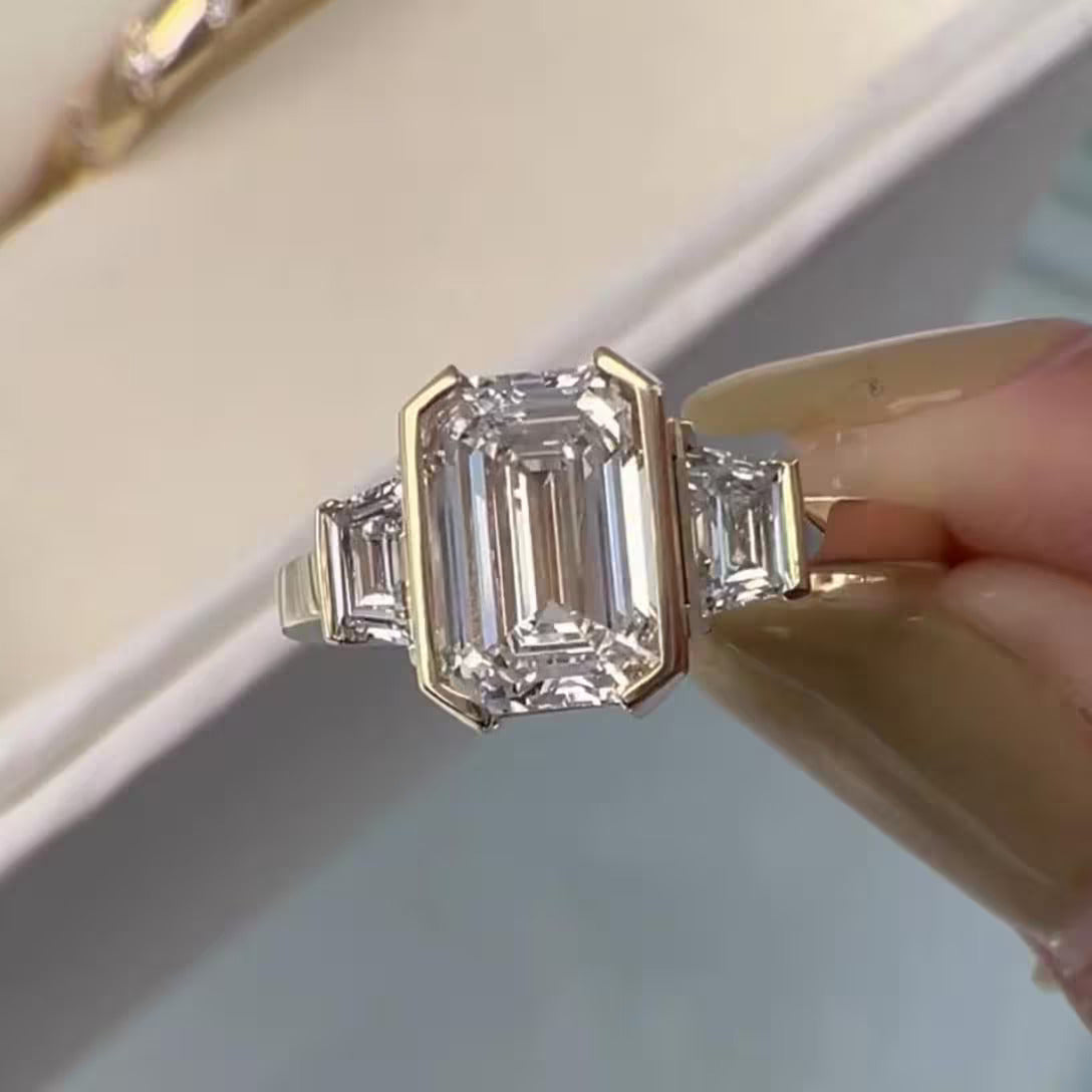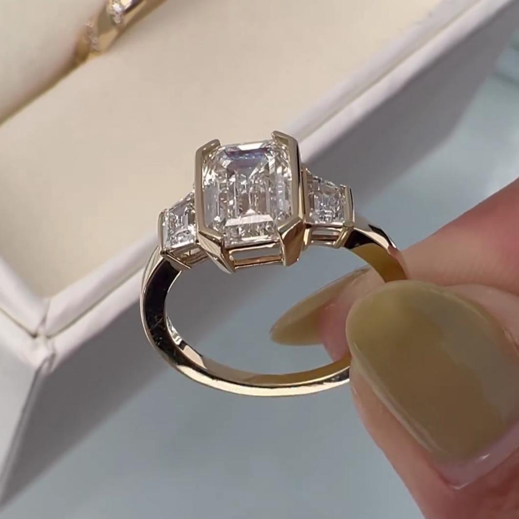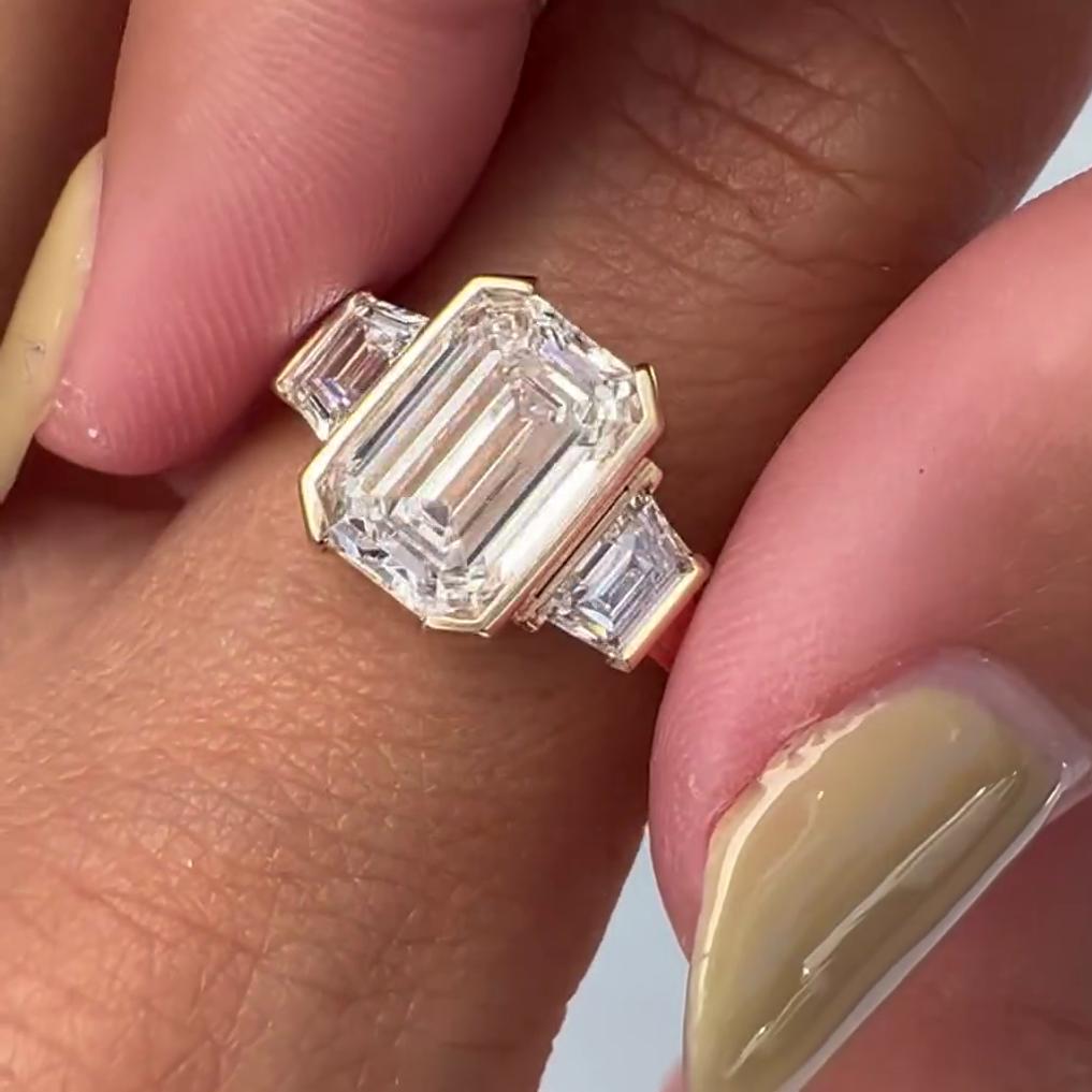Features a 3.00ct emerald-cut DEF center and 1.00ct trapezoid EF side stones, all VVS–VS clarity.