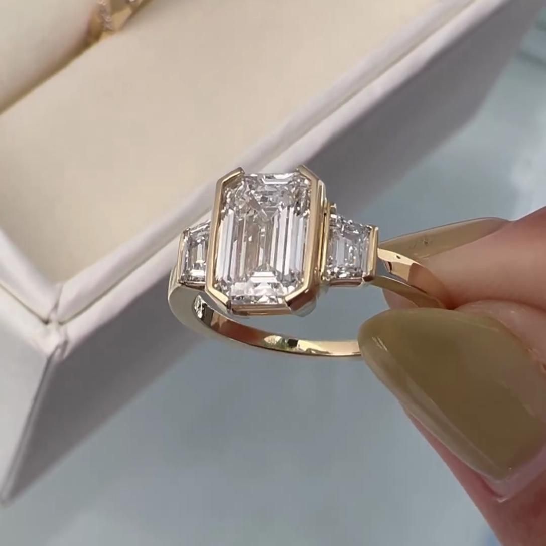 Emerald 4.00tcw Lab Diamond Three Stone Half Bezel Ring | IGI Certified | D-E-F VVS–VS