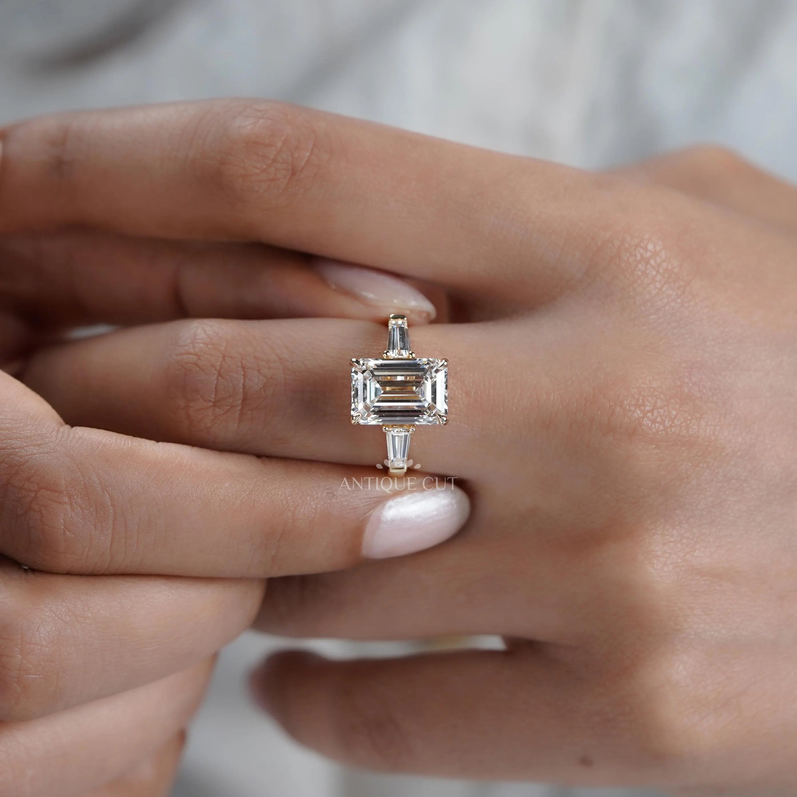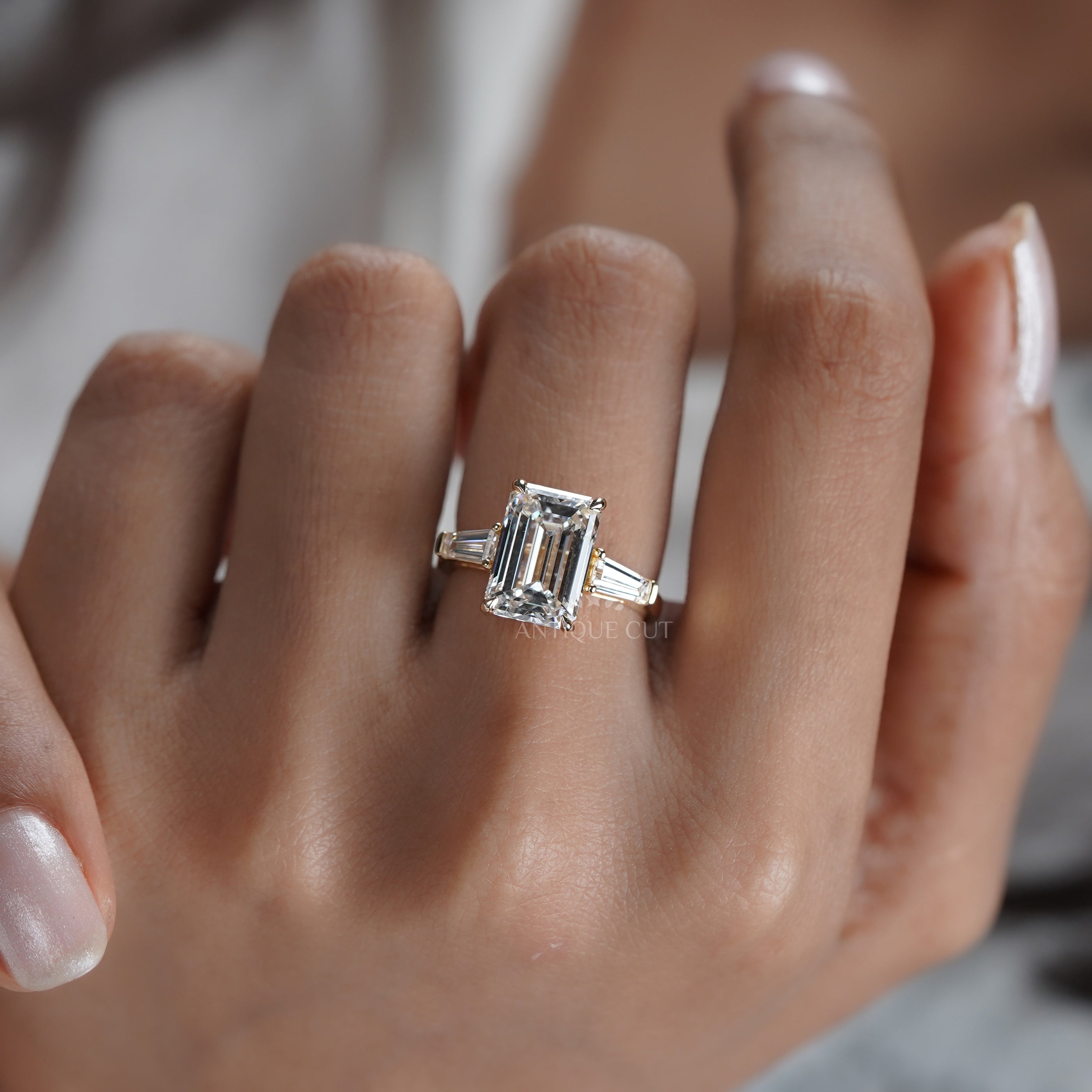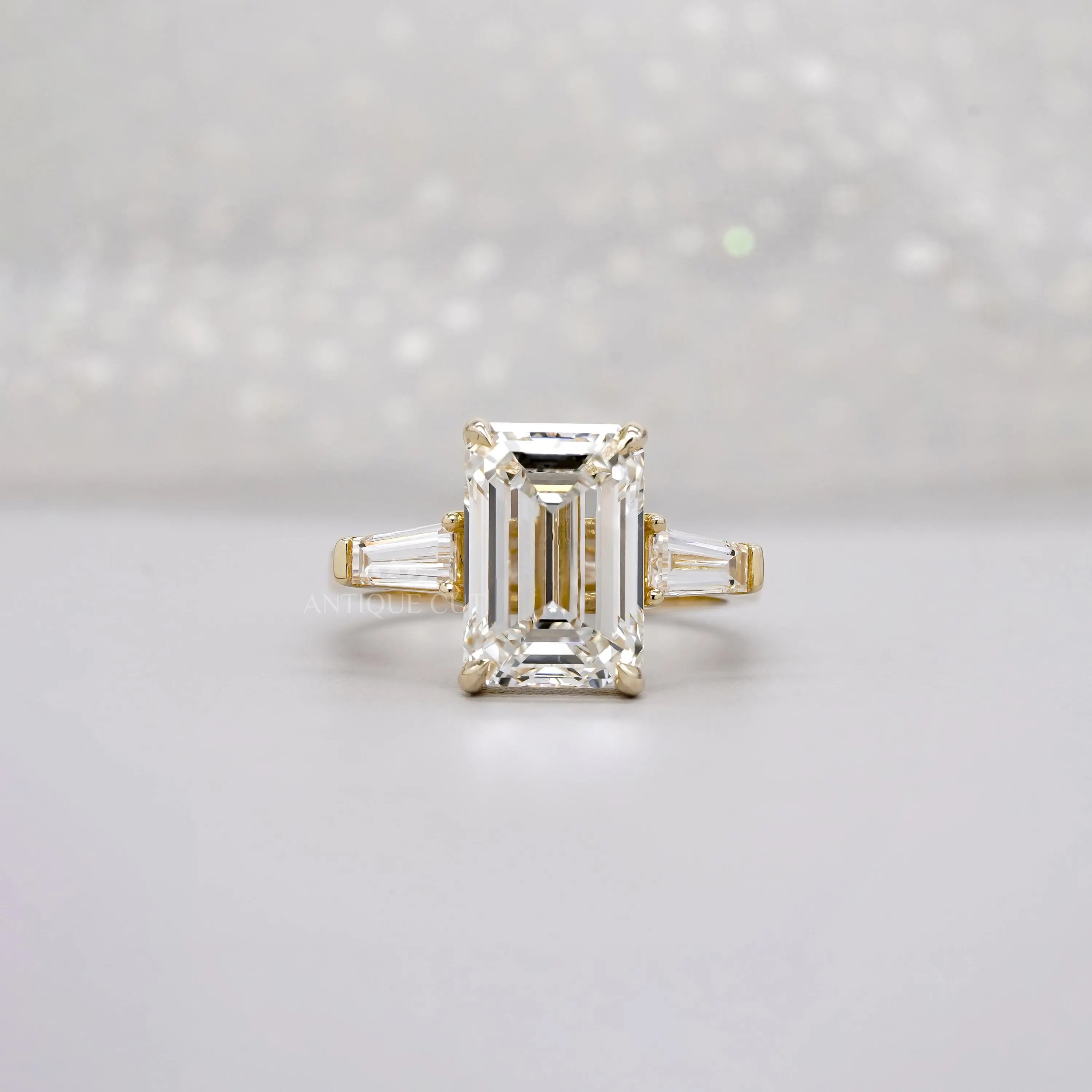 Emerald 5.60tcw Lab Diamond Three Stone Engagement Ring | Tap Baguette Side | IGI Certified