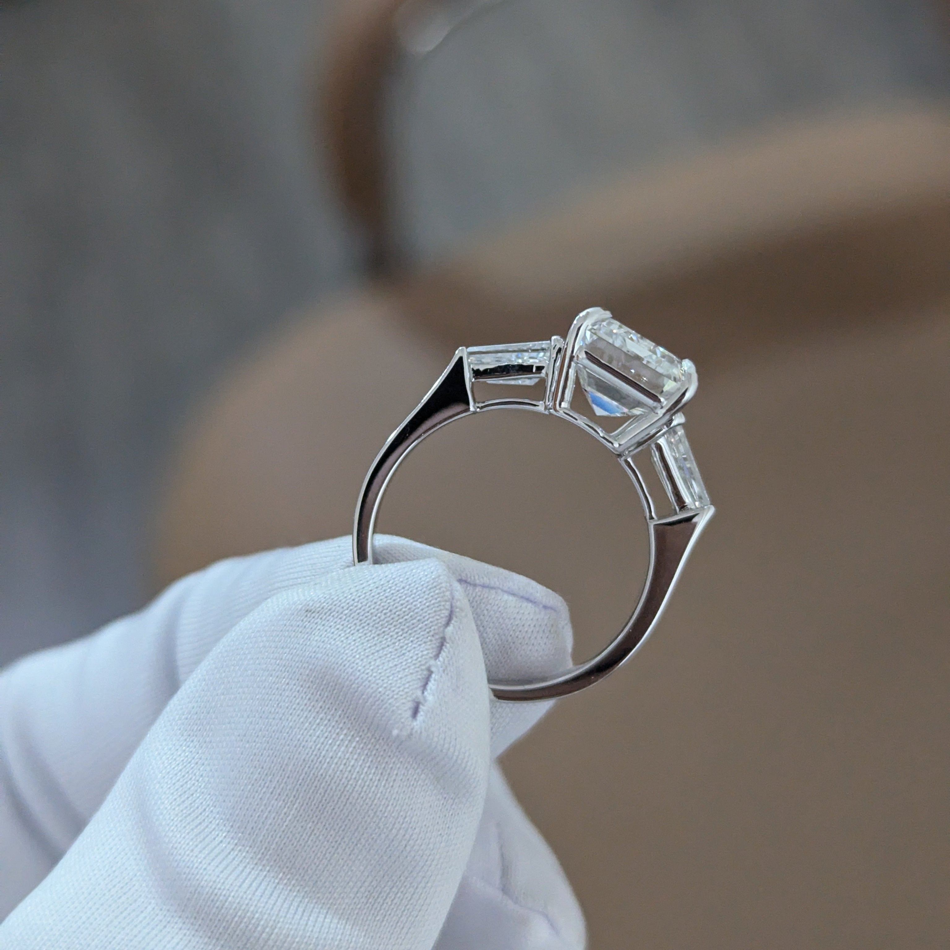Emerald 5.80tcw Lab Diamond Three Stone Ring | IGI Certified | Tapered Baguette Side Stones
