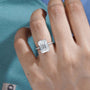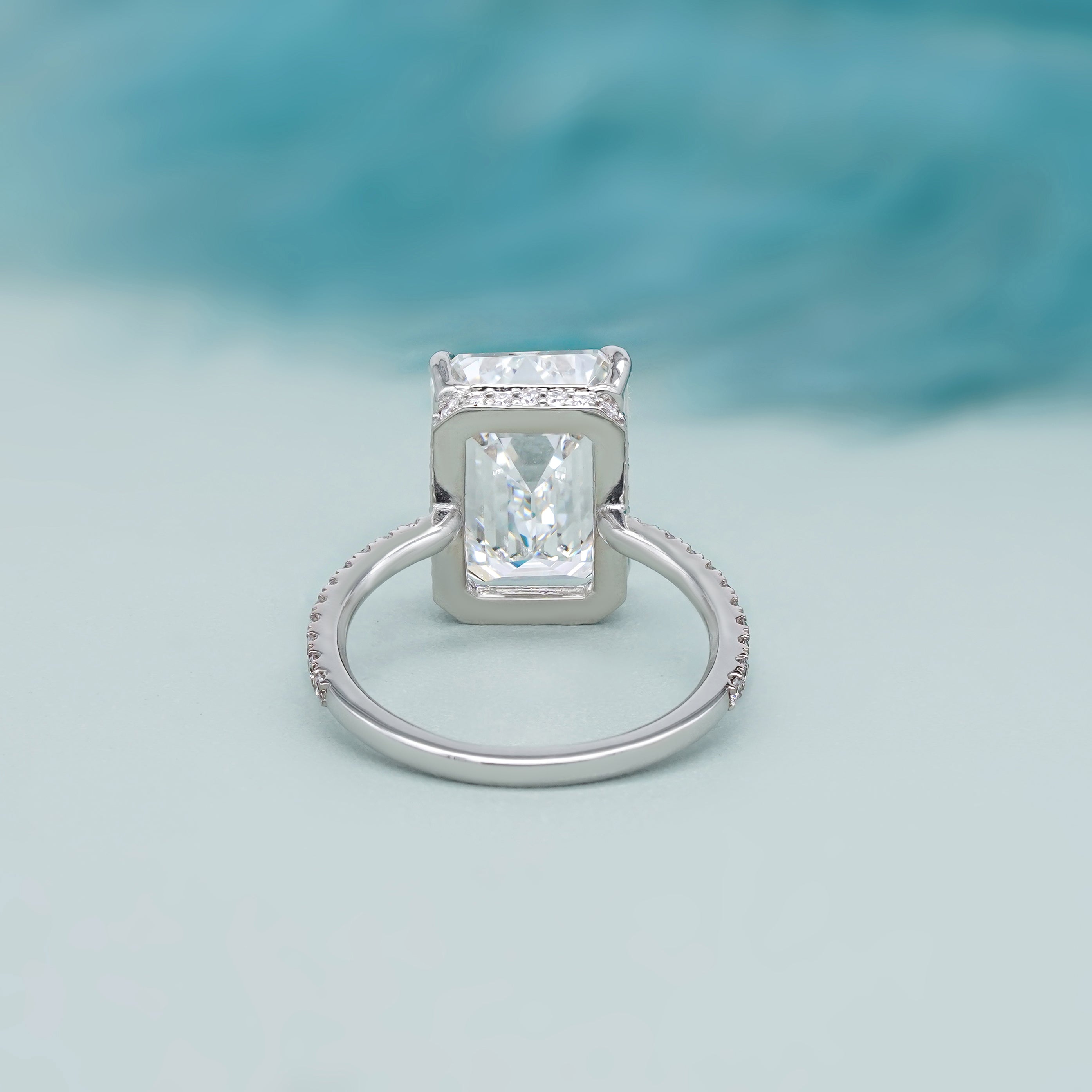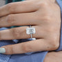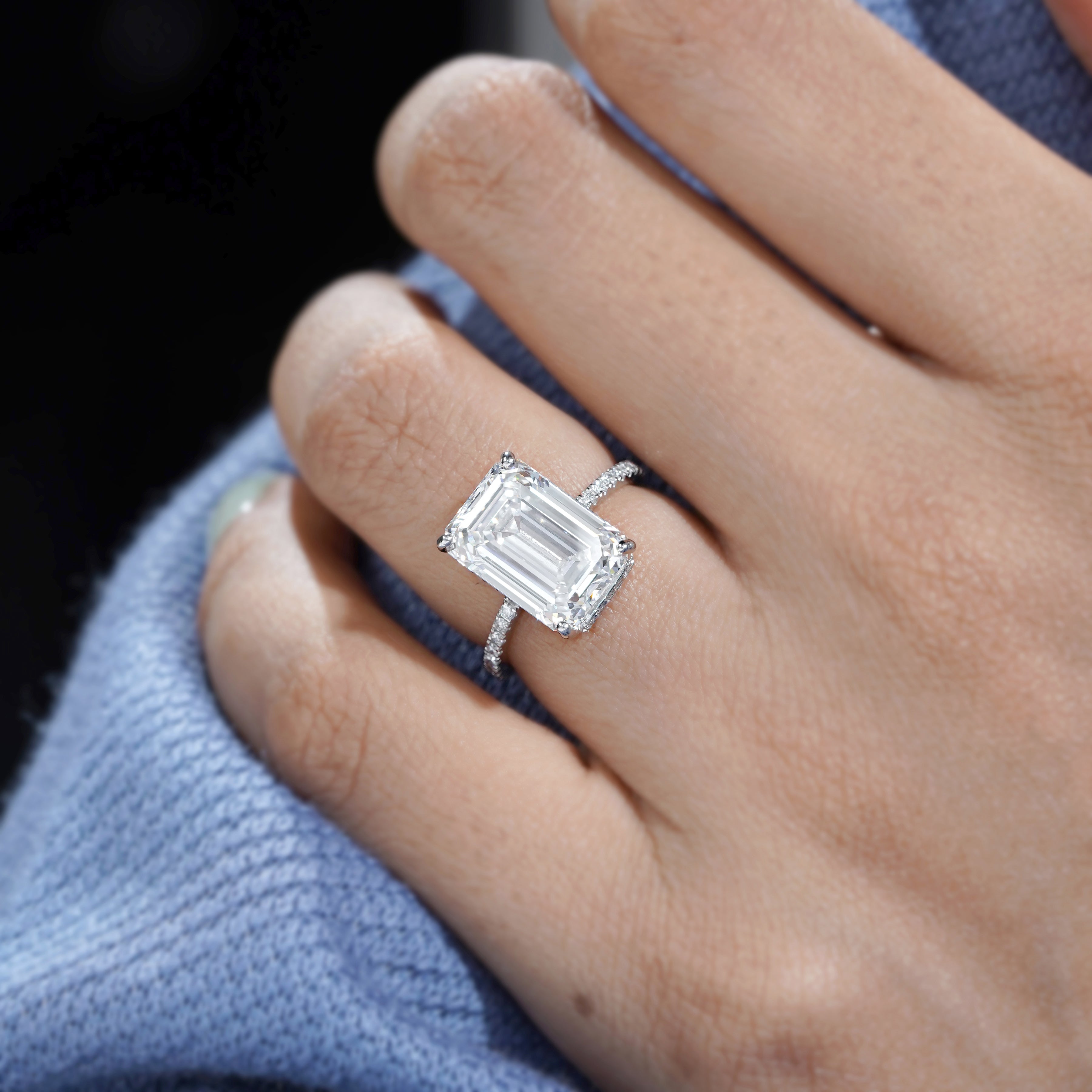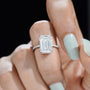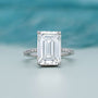 This 6.40tcw emerald lab-grown diamond ring features a 6.00ct emerald-cut center with 0.40ct pave side stones and hidden halo. IGI certified, ethically crafted.