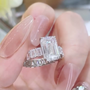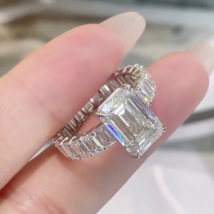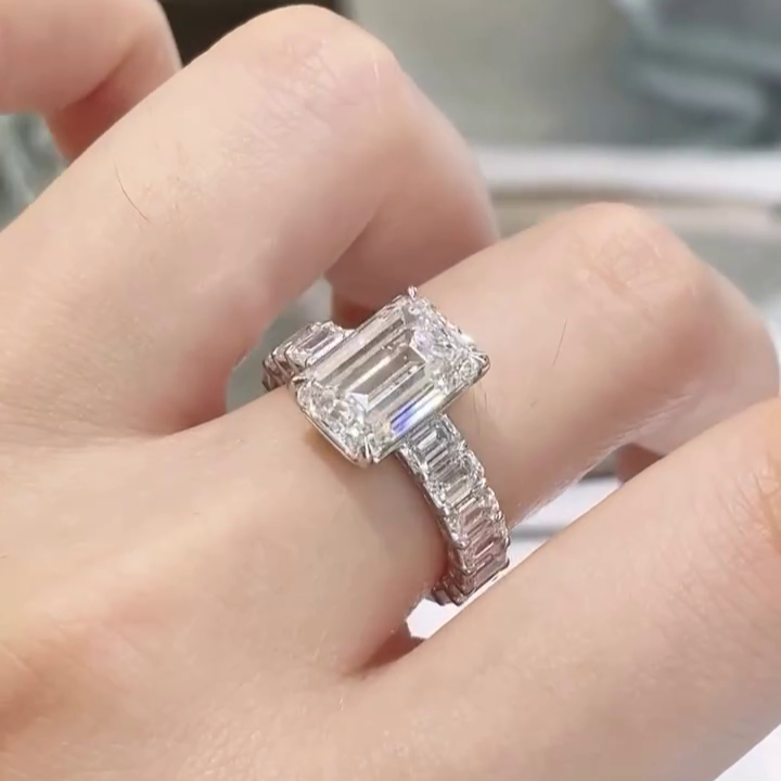 Features a bold 5.00ct emerald-cut center stone and 3.00ct matching baguette side stones, all in DEF color and VVSβVS clarity.
