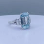 Features a 5.00ct Fancy Blue emerald-cut center diamond with 1.50ct trapezoid side stones, all VVS–VS clarity.