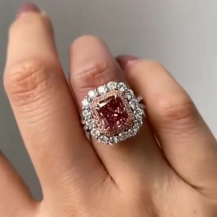 Fancy Pink 3.50tcw Radiant Lab Diamond Ring | Double Halo Sparkle | IGI Certified | Split Shank Design