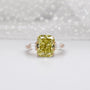 Make a bold statement with this Fancy Yellow 6.50tcw Cushion Lab-Grown Diamond Three-Stone Ring in rose gold.