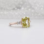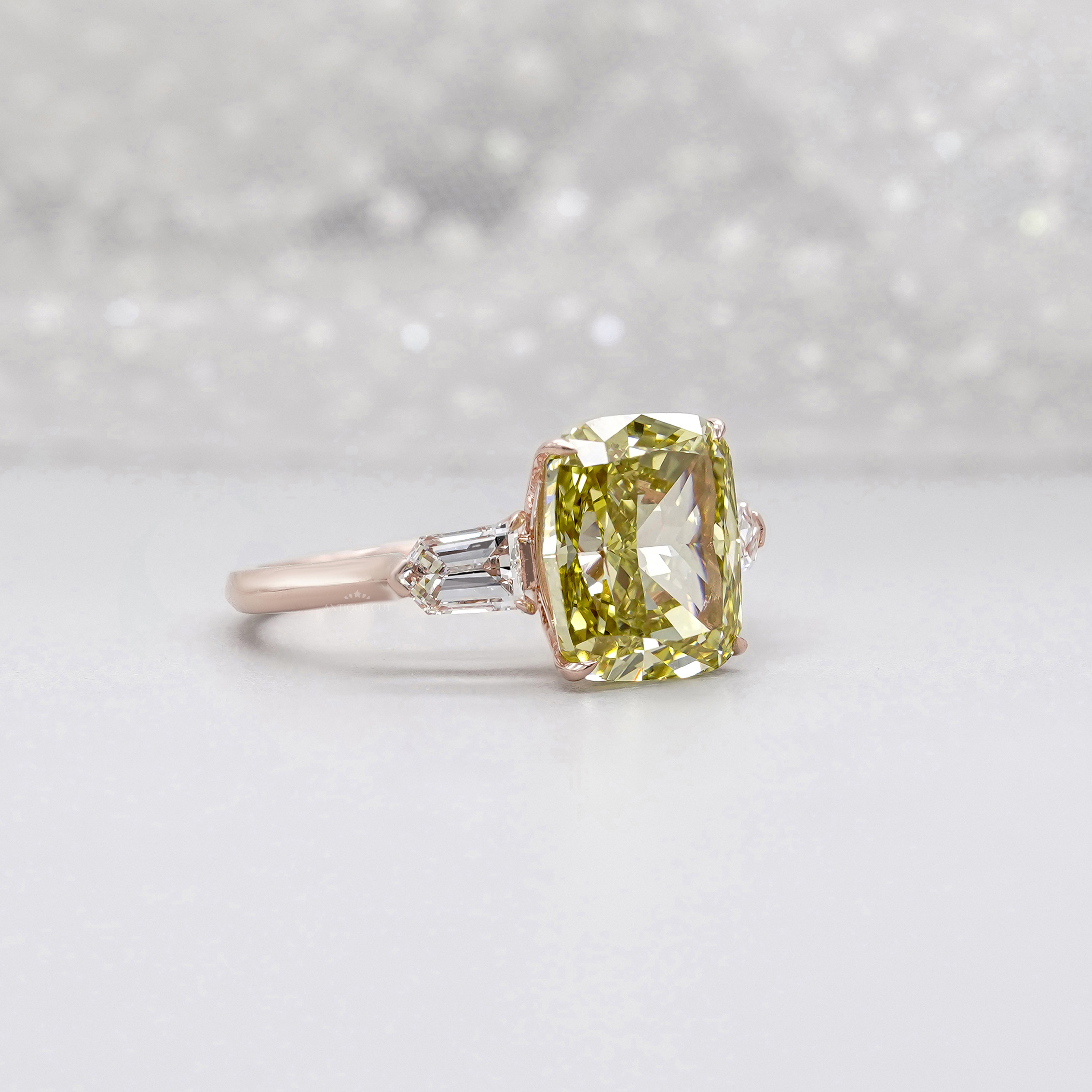 Features a 5.50ct cushion-cut fancy yellow center diamond, flanked by Bullet Cut and round side stones.
