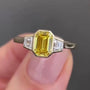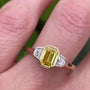 Features a stunning 1.00ct Fancy Yellow emerald-cut center diamond with 0.50ct trapezoid side stones, all VVS–VS clarity.