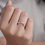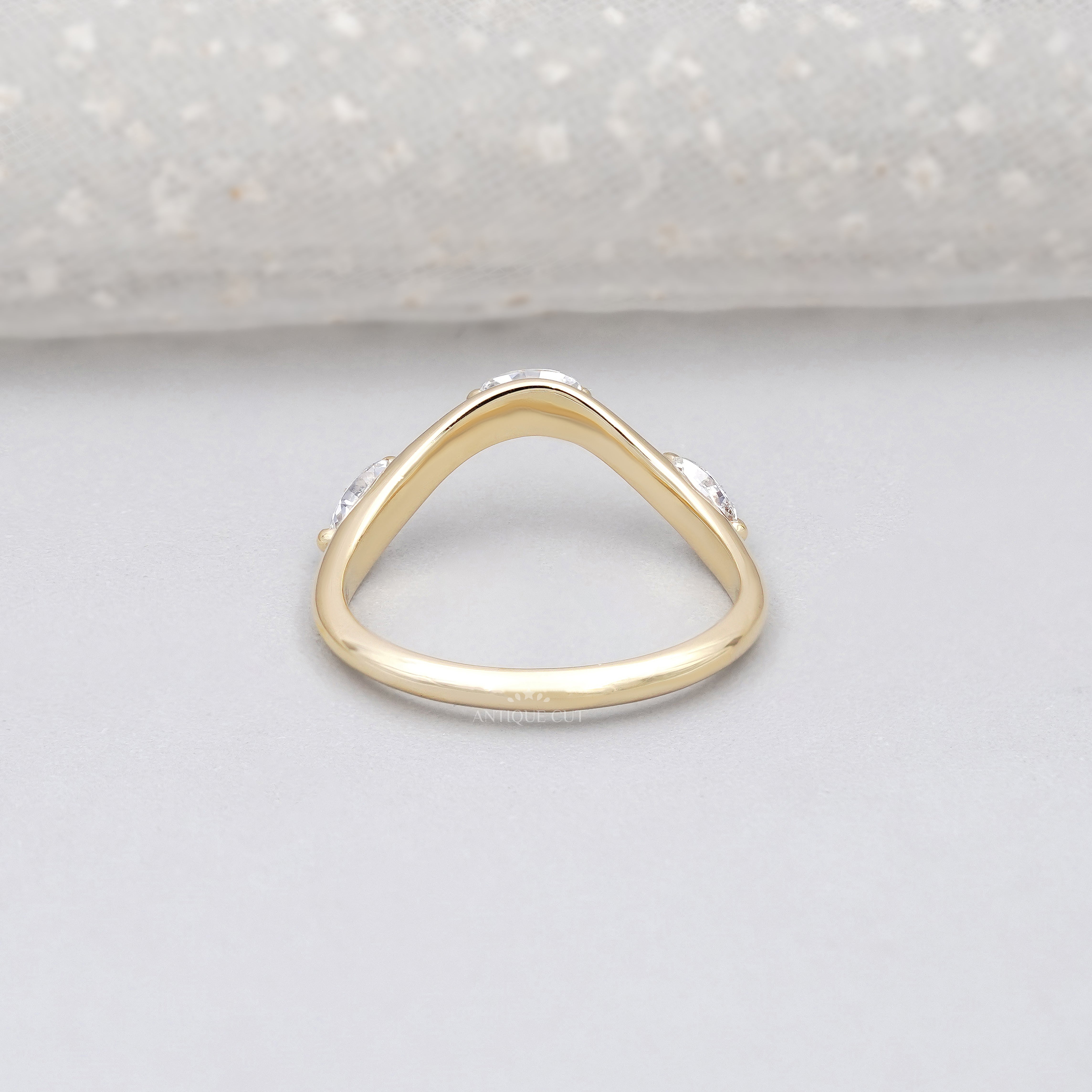 This handcrafted 0.33tcw lab grown diamond band features a graceful curved silhouette set with marquise and round diamonds. The gentle chevron shape pairs beautifully with solitaire, pear, oval, and marquise engagement rings, creating a soft contour that frames the center stone.