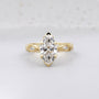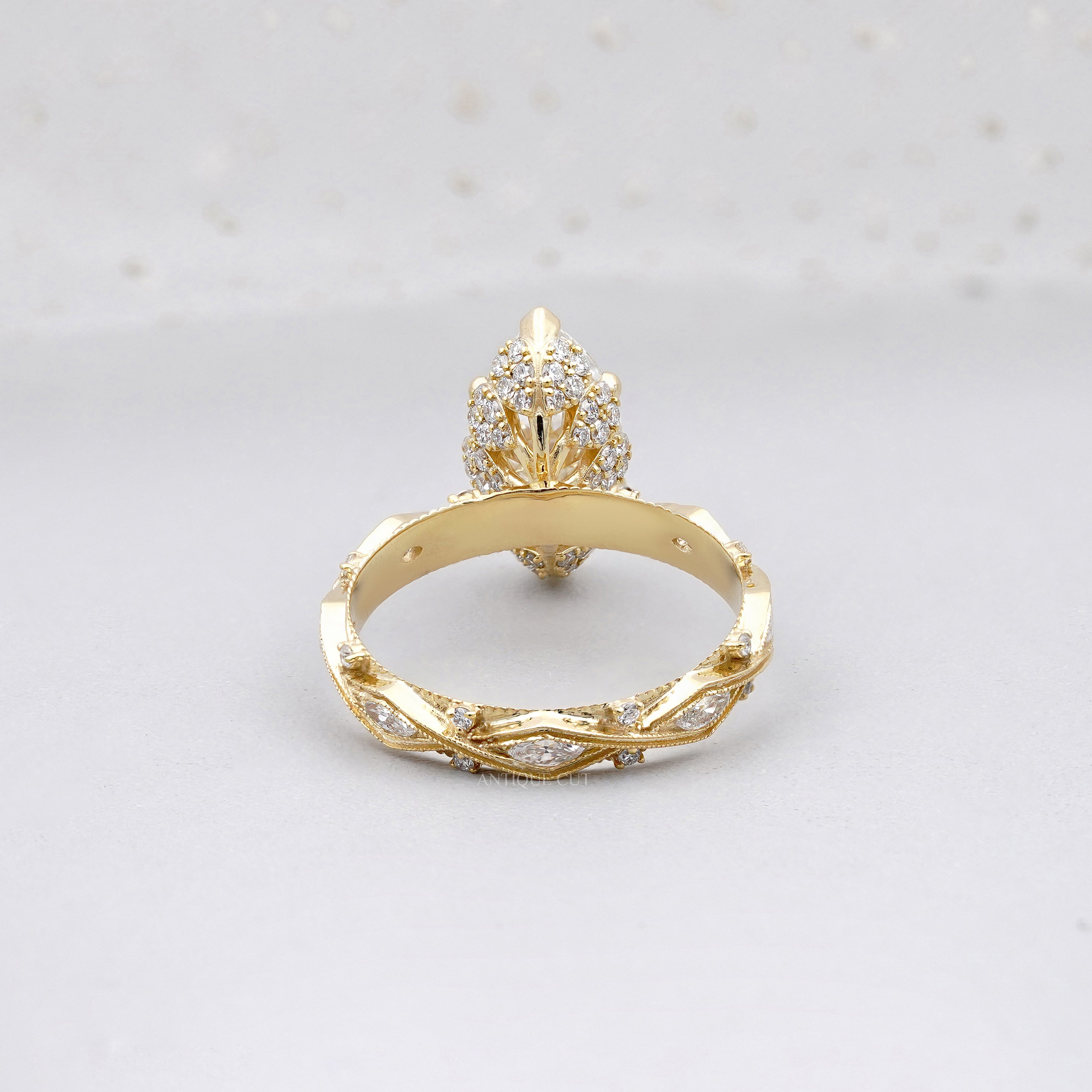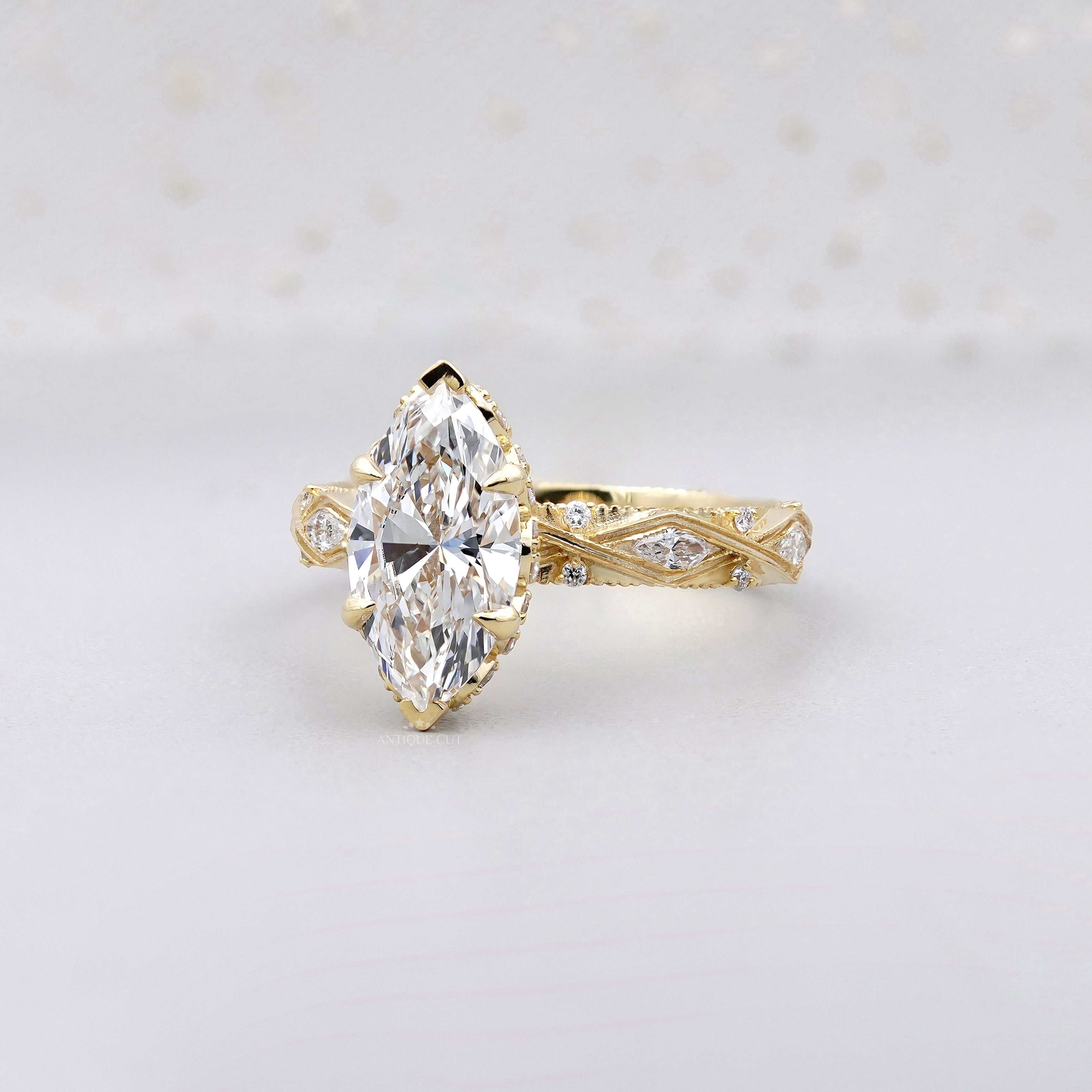 This handcrafted 3.16tcw lab-grown diamond engagement ring features a striking 2.50ct marquise-cut center stone paired with 0.66ct of accent diamonds. The band is designed with an intricate marquise-shaped pattern and pavé details that give it an antique feel while keeping the look clean and modern.