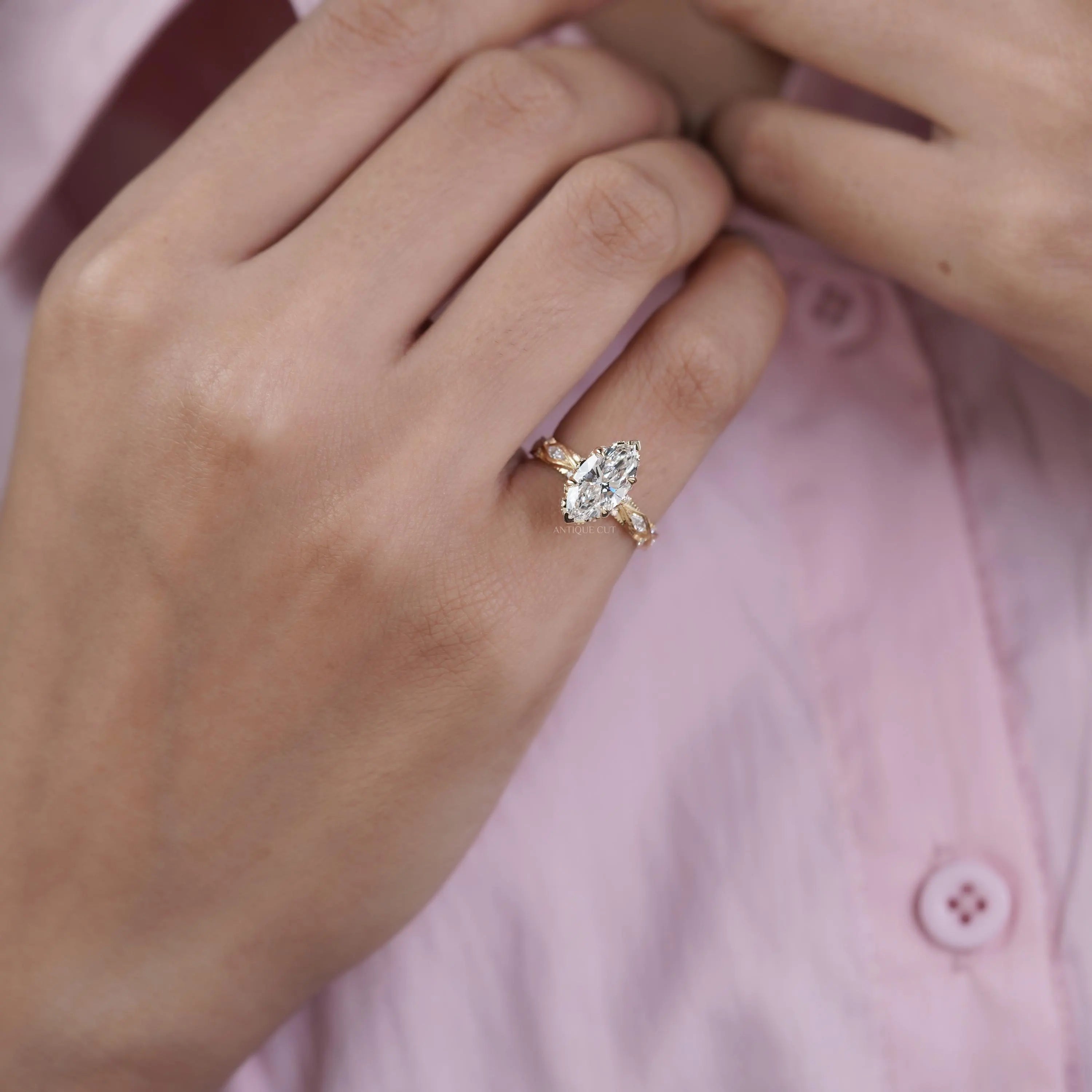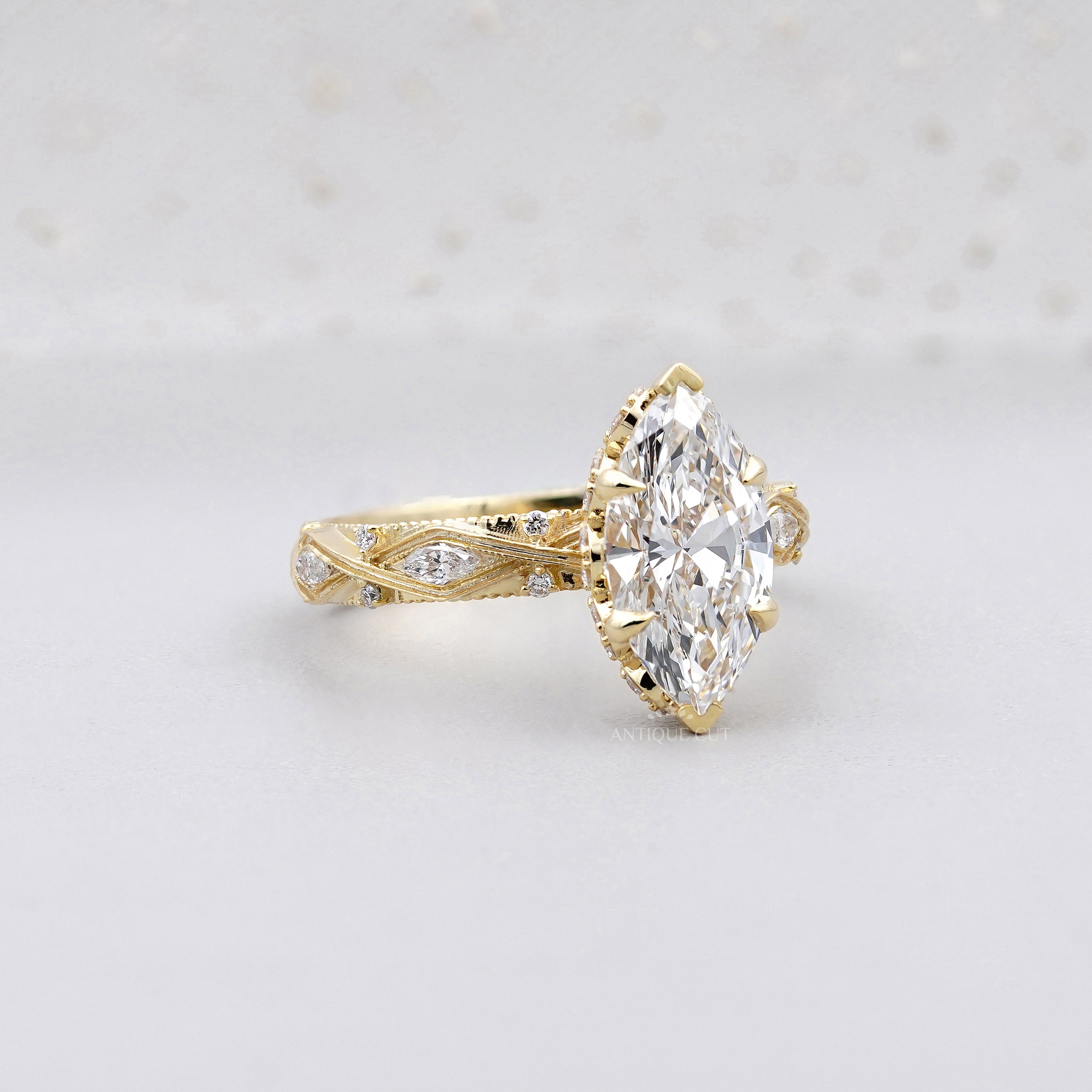 Marquise 3.16tcw Lab Grown Diamond Vintage Engagement Ring | Side Stone Antique Band | D–F Color | VVS–VS Clarity | IGI Certified
