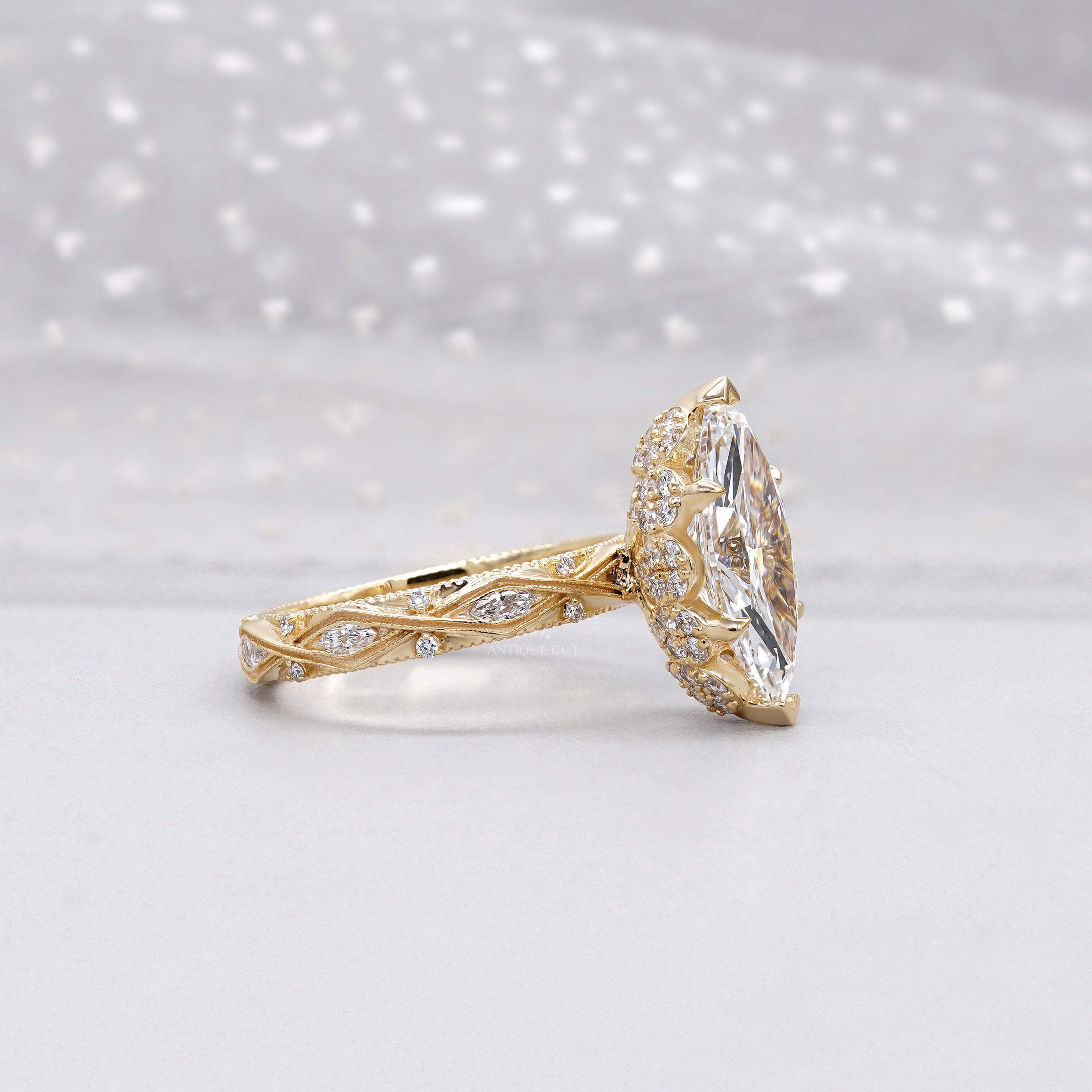Celebrate timeless beauty with this 3.50tcw Marquise Lab-Grown Diamond Vintage Engagement Ring in 18K Yellow Gold.