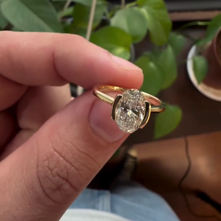 A stunning 1.50ct oval-cut lab-grown diamond engagement ring in a sleek full bezel setting. IGI certified, D-E-F color, VVS–VS clarity. Handcrafted in solid yellow gold — modern, ethical, and made to last.