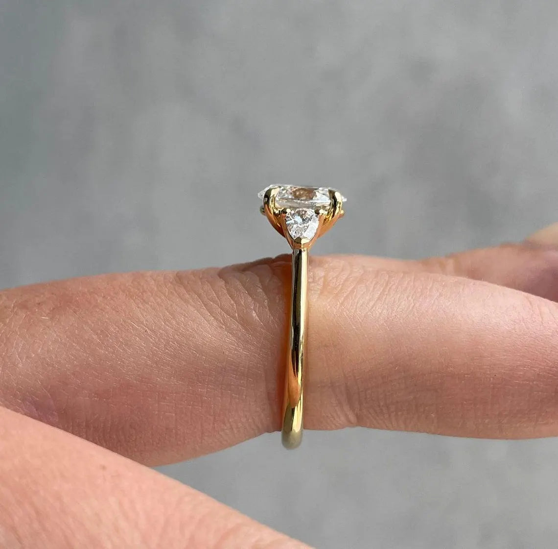 💎 Celebrate your love with this 2.00tcw Oval Lab-Grown Diamond Three Stone Ring with Pear side stones. Features a 1.50ct Oval-cut DEF center diamond and 0.50ct Pear-shaped EF side stones, all VVS–VS clarity. IGI certified and ethically crafted — perfect for timeless elegance and graceful charm