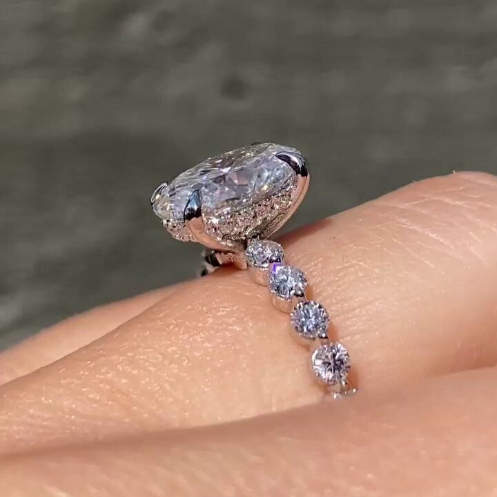 This 2.50tcw Oval Lab-Grown Diamond Ring features a 2.20ct center and 0.30ct pavé side stones with hidden halo. IGI certified, D–E–F color, VVS–VS clarity — handcrafted in white gold for ethical luxury and modern elegance.