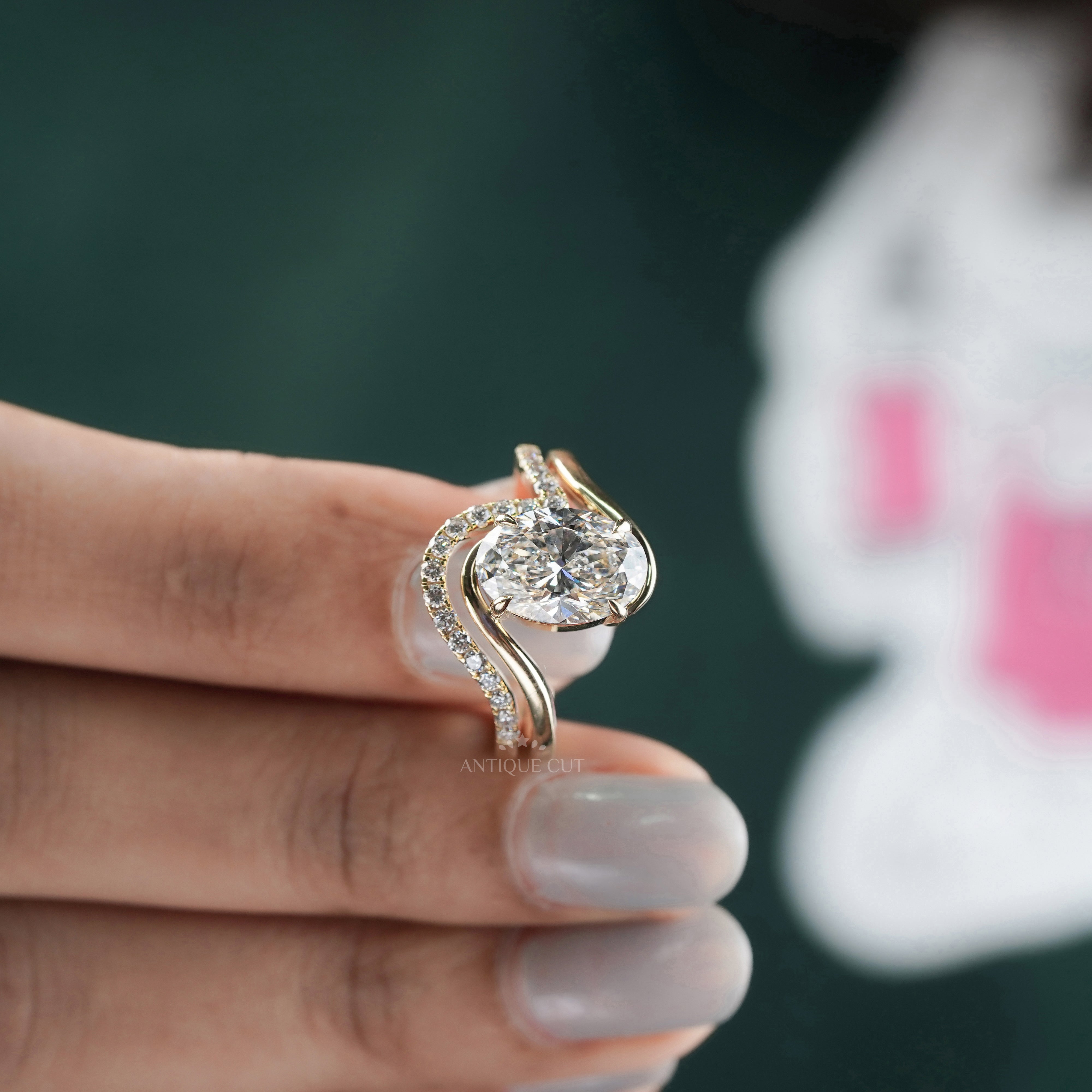 Make a bold statement with this 3.20tcw oval lab-grown diamond bypass engagement ring, featuring a sleek curved pavé band in platinum. This modern design showcases a stunning 3.00ct oval center stone and 0.20ct round accent diamonds, all in DEF/EF color and VVS–VS clarity for exceptional brilliance. IGI certified and expertly handcrafted, it is an ideal choice for proposals, anniversaries, or milestone celebrations.