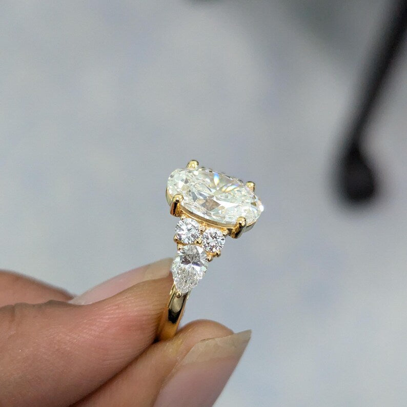 Stunning 3.80tcw Oval Lab-Grown Diamond Engagement Ring with pear and round side stones. Features 3.00ct center, DEF color, VVSβVS clarity. IGI certified. Customizable in 10k/14k/18k gold. Ethically made, ships in 5β7 days from India.