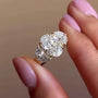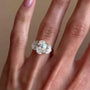 Features a 4.00ct oval center stone and 2.00ct Halfmoon side stones, all in DEF color, VVS–VS clarity.
