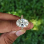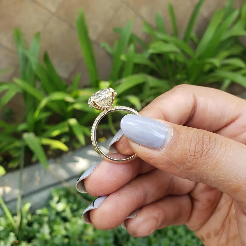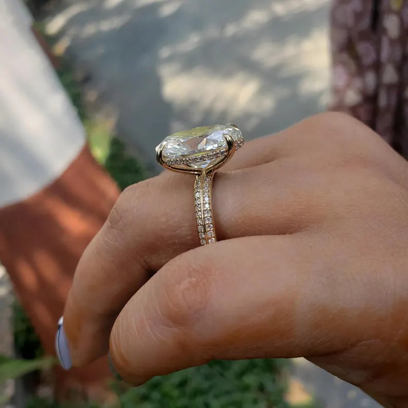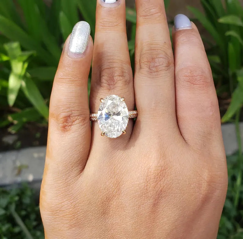 A breathtaking 9.40tcw Oval Lab-Grown Diamond Engagement Ring featuring a 9.00ct center stone with a 0.40ct hidden halo in EF color, VS clarity. Crafted in a bold knife-edge band and available in 10k, 14k, or 18k gold. IGI certified and ethically grown — timeless elegance with a striking twist.